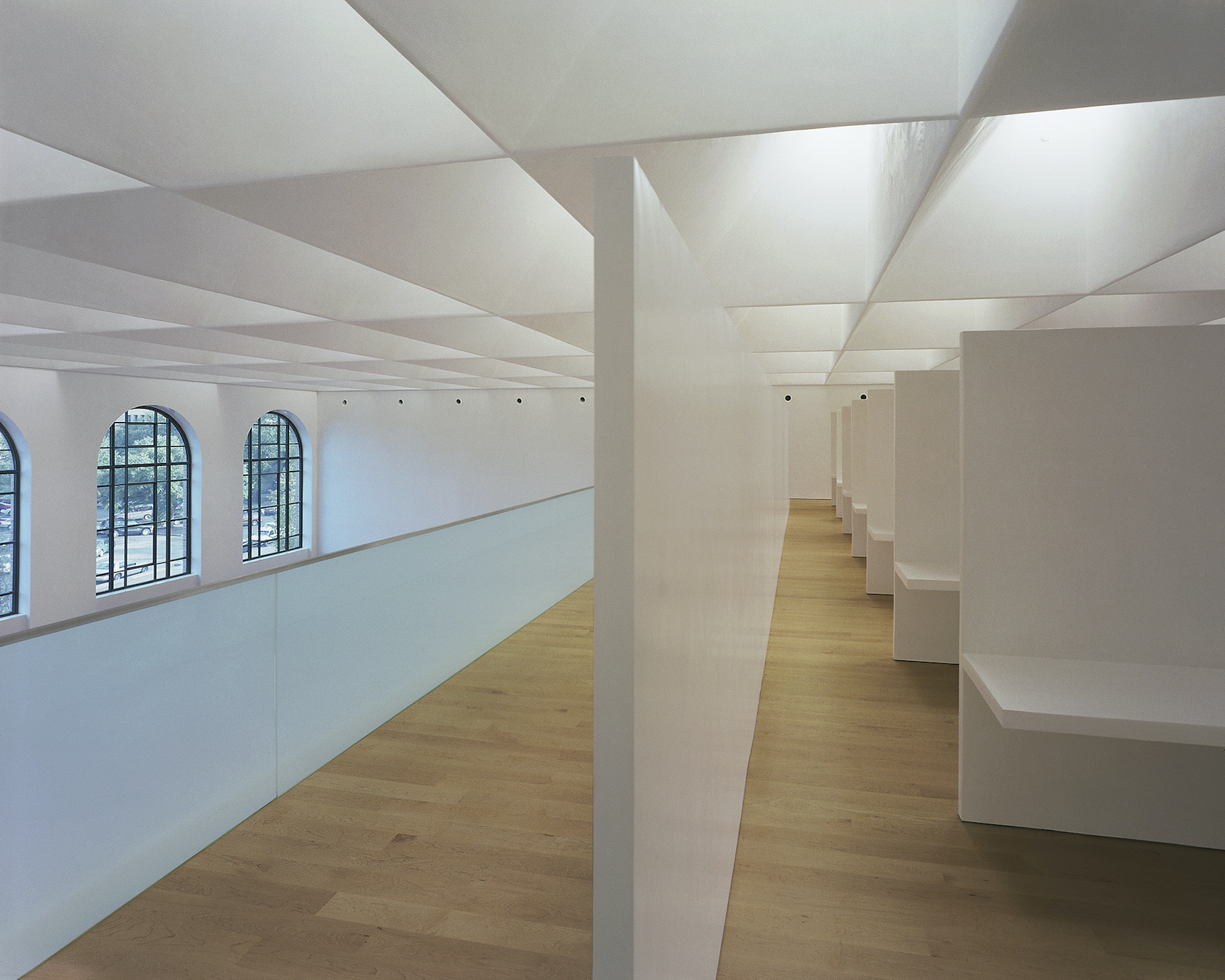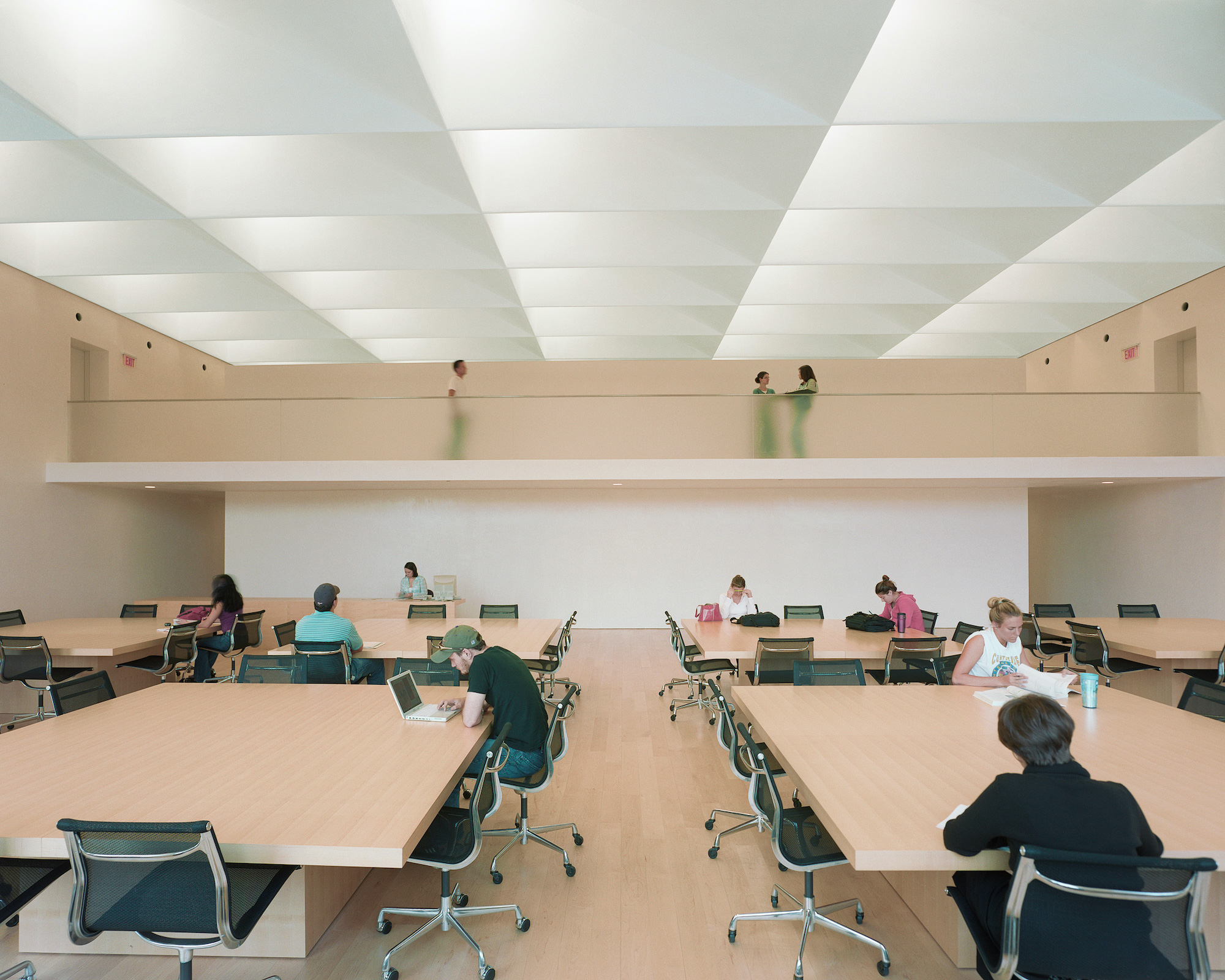 For that reason, Trahan and his team used a limited palette of materials—from wood to stone to plasters—to move the design away from the surface world of contemporary trends and into a more contemplative space. Where one person might identify a white, sun-streaked wall as a vacancy, for example, Trahan sees a potential “canvas for human occupation” where students and faculty—not dated décor—become the ever-changing focal points of a room.