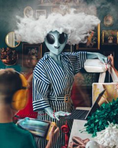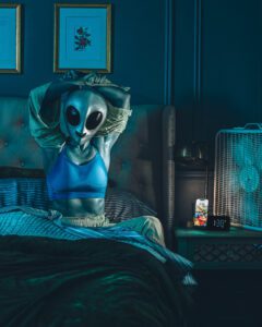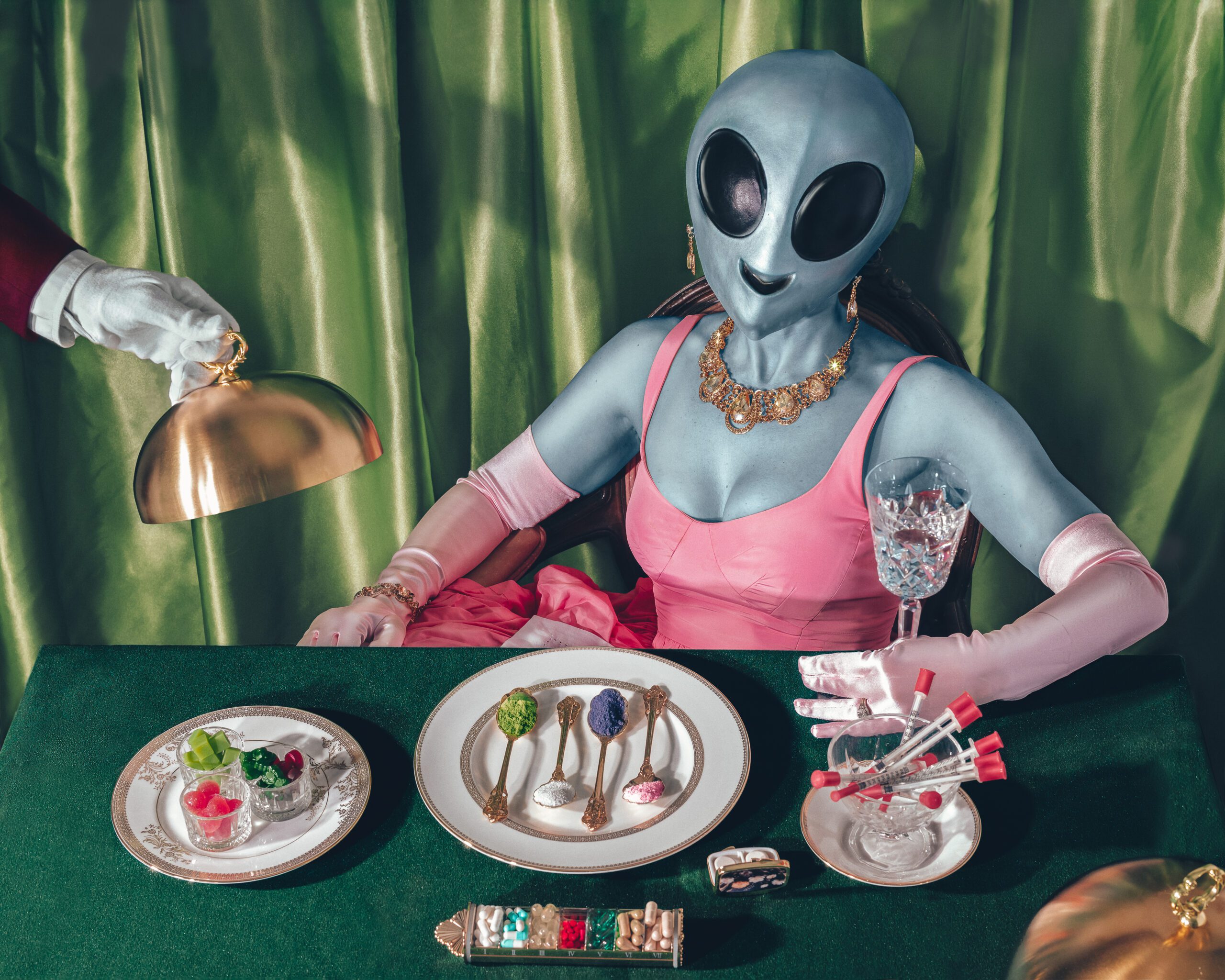 Titled “Greetings … I’m Peri,” the photo series is an ongoing project that starts with the images displayed on these pages and will continue on Haxthausen’s social media accounts. From concept to sourcing props to editing, each photo takes at least eight hours to complete, often with the help of Haxthausen’s husband and three children. But it’s a labor of love, she says, that is worth every odd Amazon order or public outing in an alien costume.