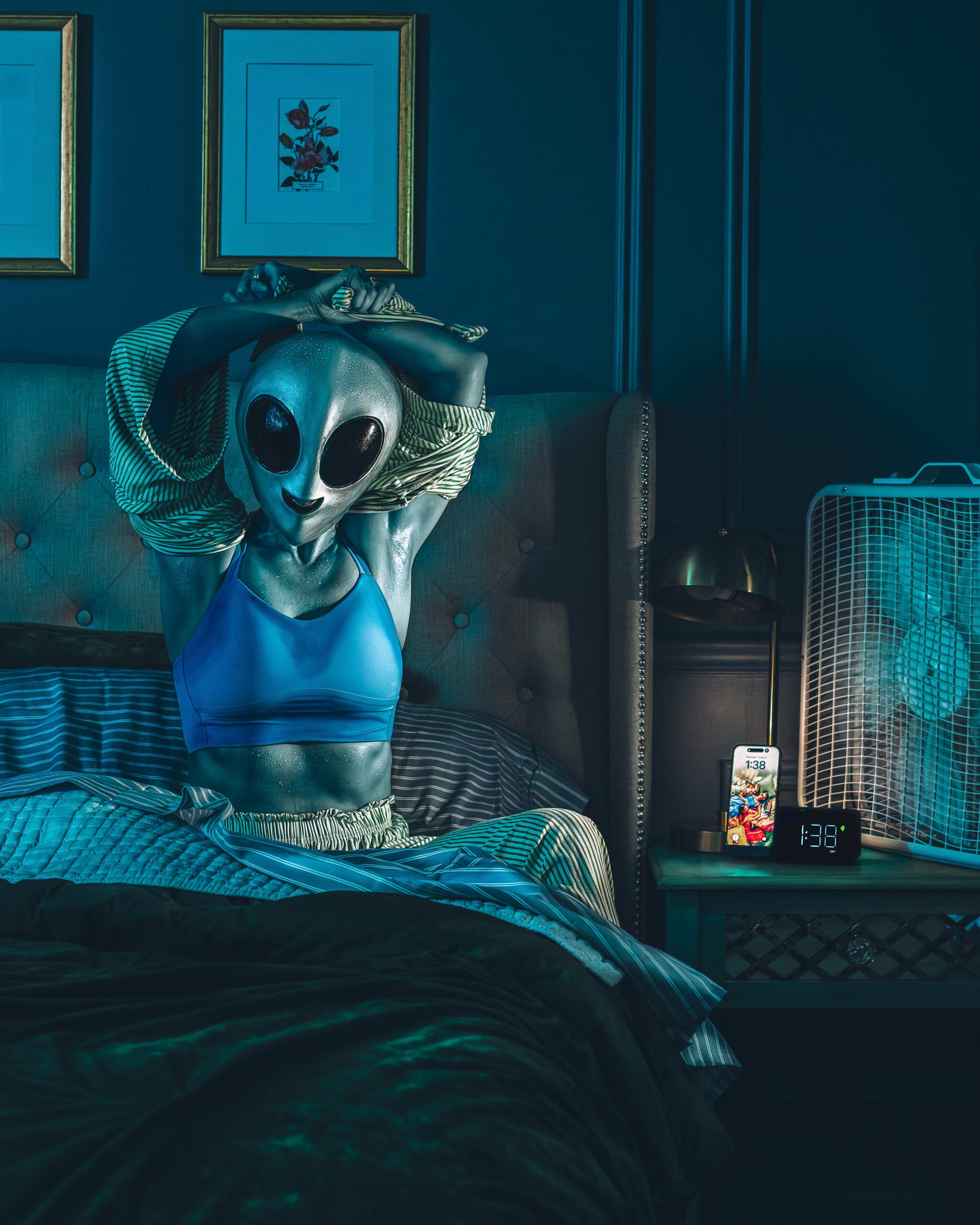 In each image, she dramatizes a perimenopause symptom or byproduct that is interrupting her daily life. There are night sweats, brain fog and irregular periods, in addition to inconveniences like navigating complicated supplement regimens and desperately seeking out solutions or other possible remedies.