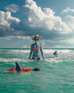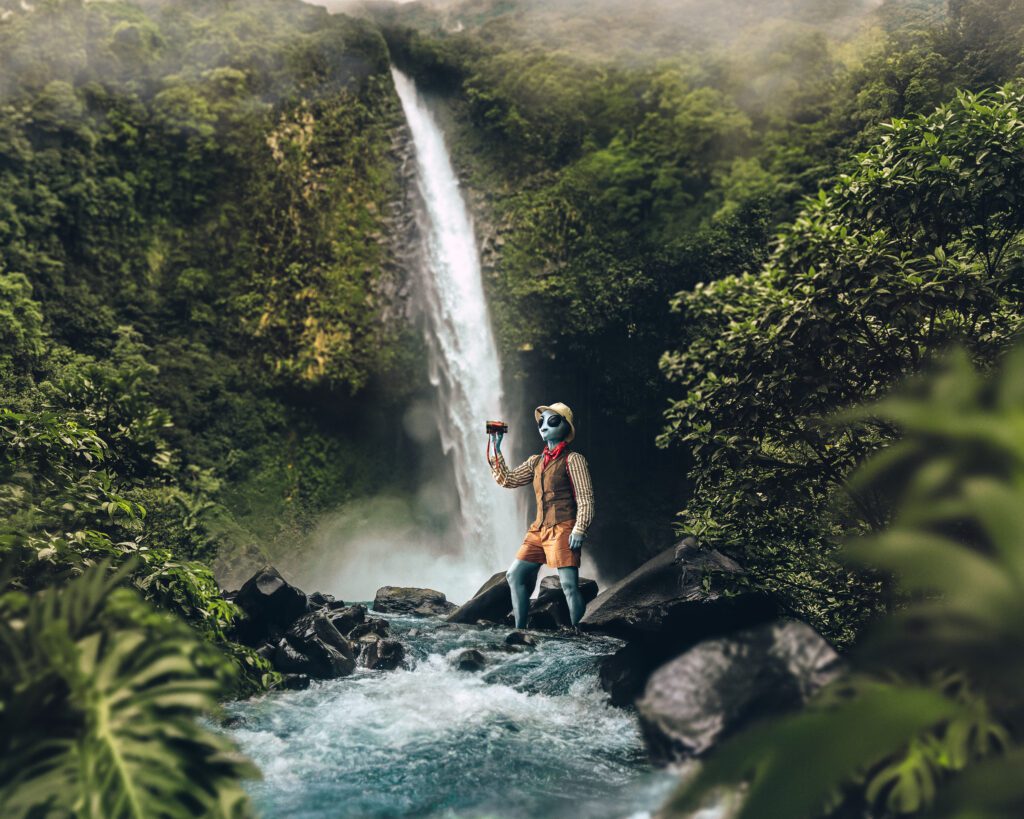 There’s a bit of irony involved in this endeavor to not feel “crazy,” though. Haxthausen says it was when she was hiking through the rainforest with an alien mask and retro safari costume in tow that she had the fleeting thought that maybe, just maybe, she had lost her mind. “While I was trying to pose without being able to talk and barely able to breathe in the mask, and our tour guide was just snapping away with no directives on if he got it or how we needed to adjust, I wondered what on earth I was doing,” she recalls. “But it all worked out in the end.”
