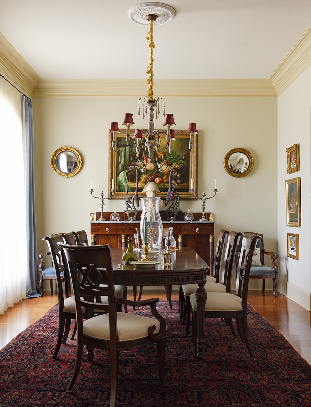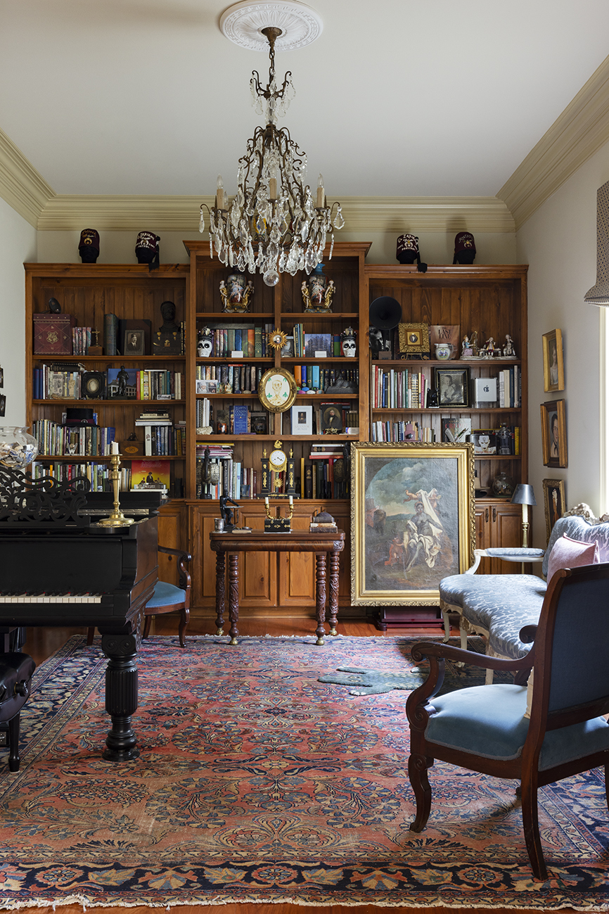 When Jeremy wasn’t immersed in finding out more about the Bélizaire painting and its origins, he and Lindsay were busy moving into their current home in the Country Club of Louisiana. Each room became a showplace for the treasures they had discovered, and even the arrangement of the rooms was part of the plan. The living room’s mix of antique and vintage furniture from several different eras, for example, draws inspiration from Maison Chenal, the 18th-century Pointe Coupee Parish home where noted collectors Jack and Pat Holden lived out the French concept of “tout ensemble.” The Holdens’ names pop up again and again in conversation here, as Jeremy points out a pair of Old Paris porcelain pieces that were once in the Holdens’ residence in New Orleans’ Pontalba Apartments, and he recalls that he placed a phone bid for the piano that now sits in his library, while walking through one of the Holdens’ historic homes.