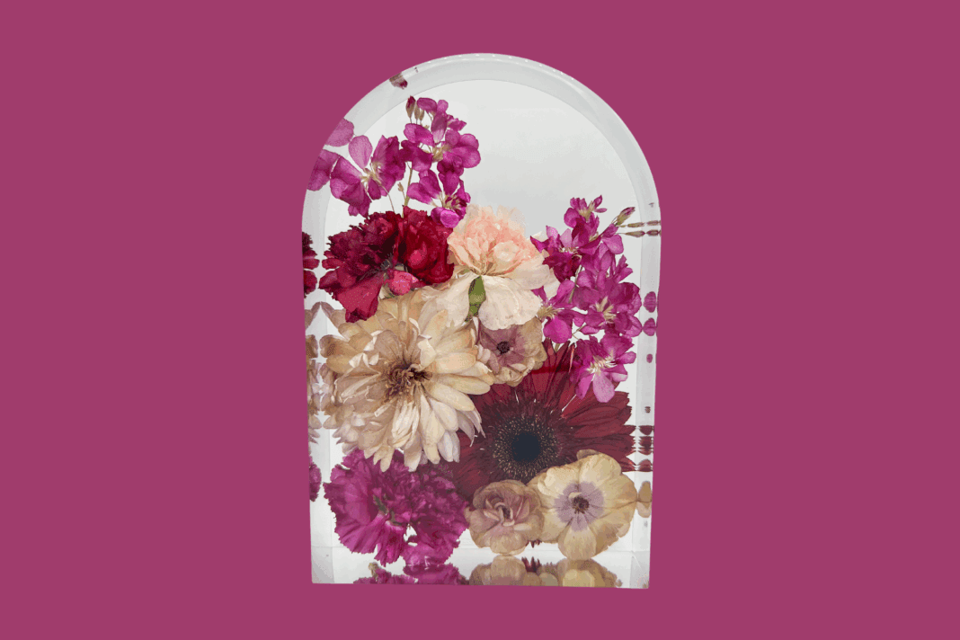 After Catalano’s 2021 wedding, her bridesmaids gifted her a serving tray crafted from her preserved bridal bouquet, and she says it remains one of the most meaningful gifts she has ever received.