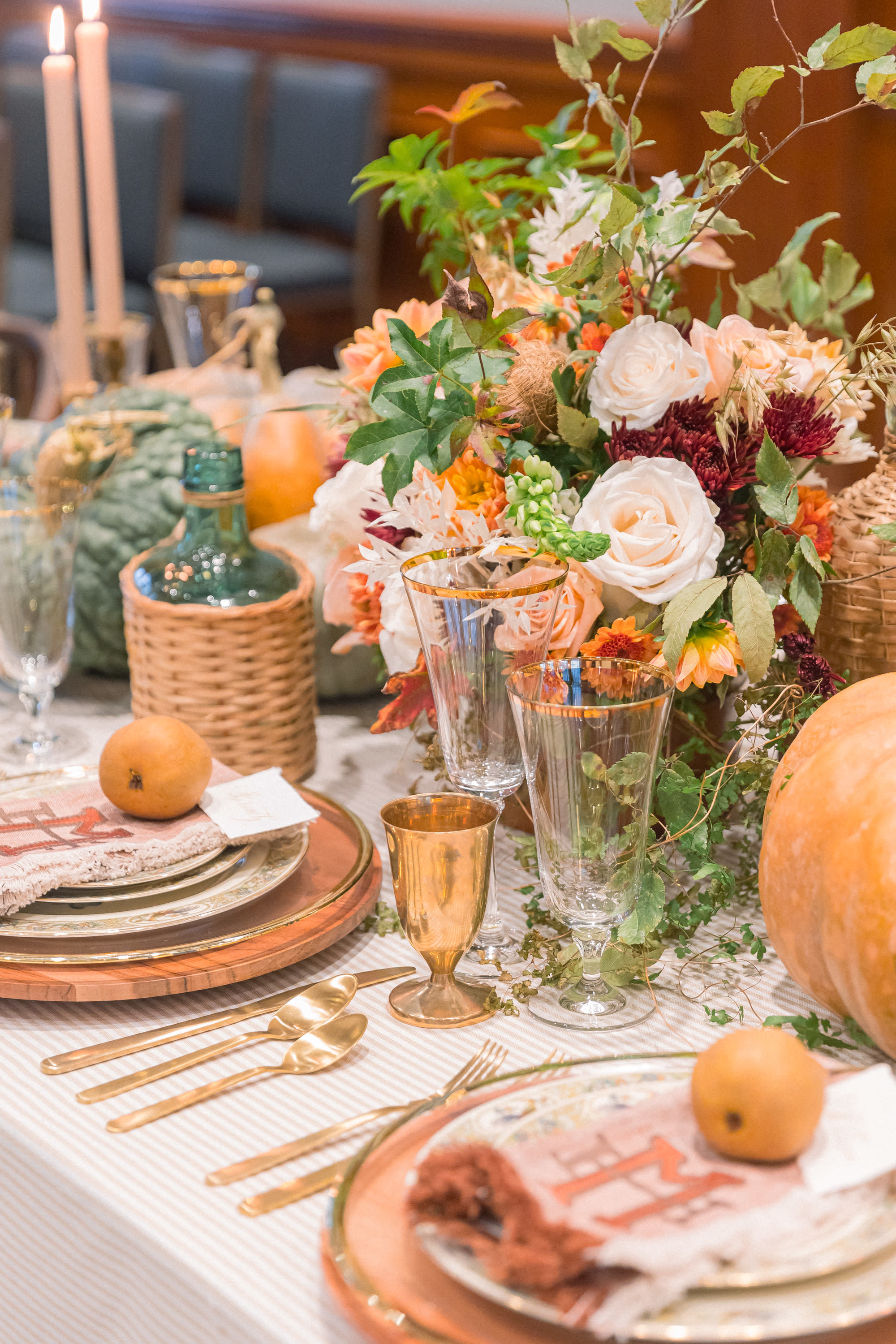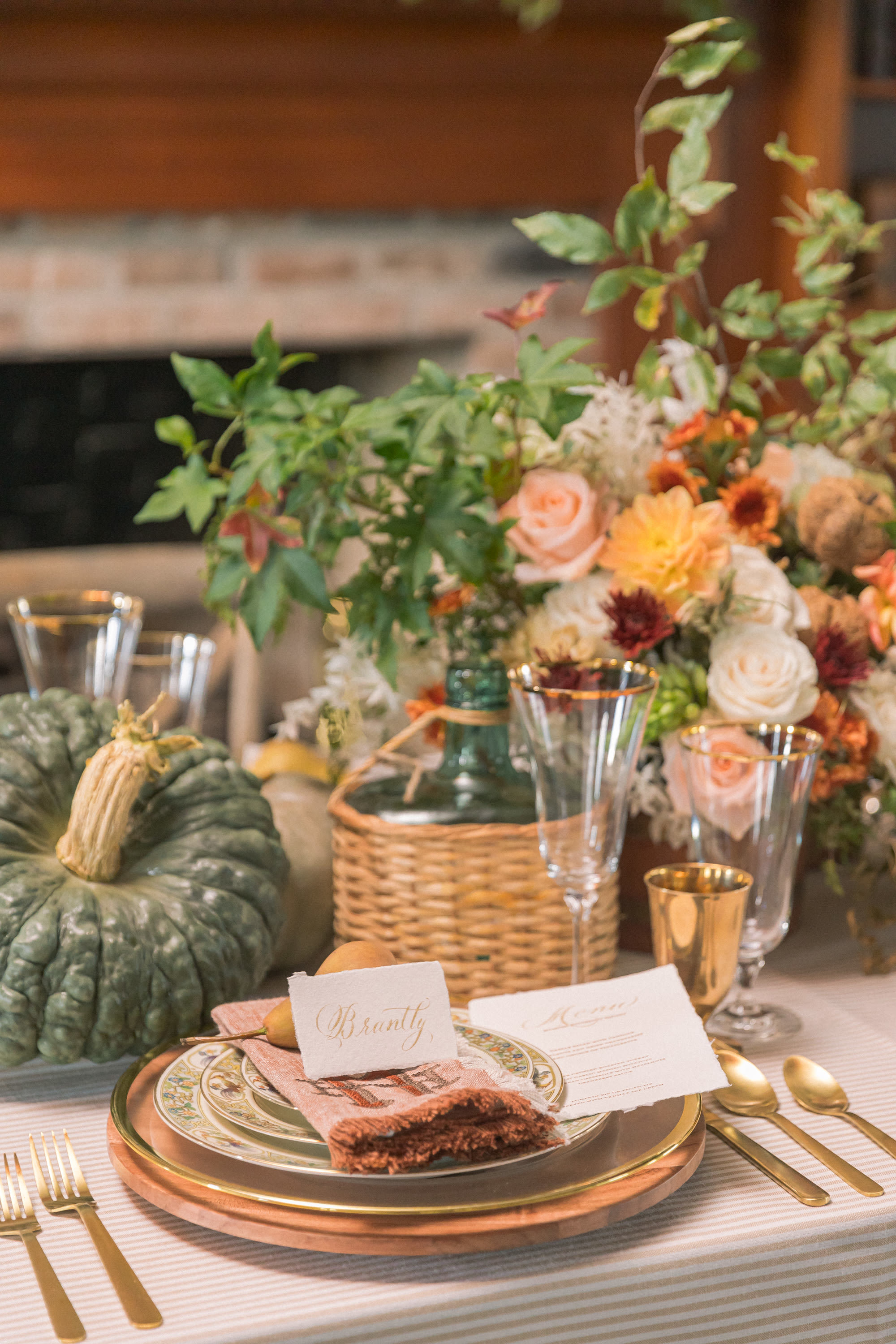 The centerpiece for this scene pulls in the traditional pumpkins you might expect on a Thanksgiving table, but Babin added unexpected natural details including foraged greenery and roses and shades of peach and maple. To get the color scheme just right, she also used bleached Italian ruscus and even applied a special floral spray paint to dahlias to give them the perfect coordinating copper hue. Eclectic touches including wicker-wrapped chianti bottles from Rescued Revisions, candles from Anthropologie and fringed monogrammed napkins, complete the look.
