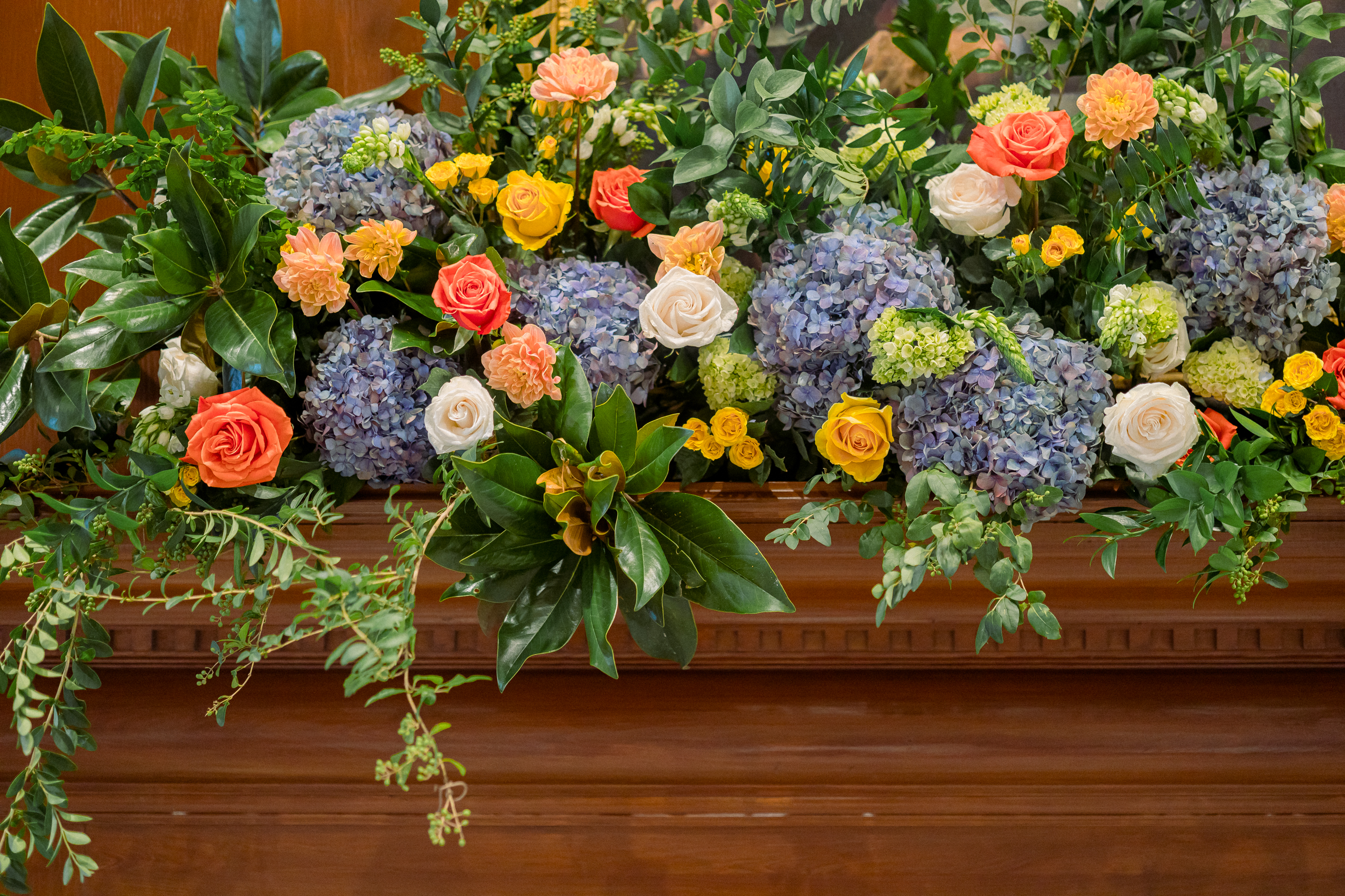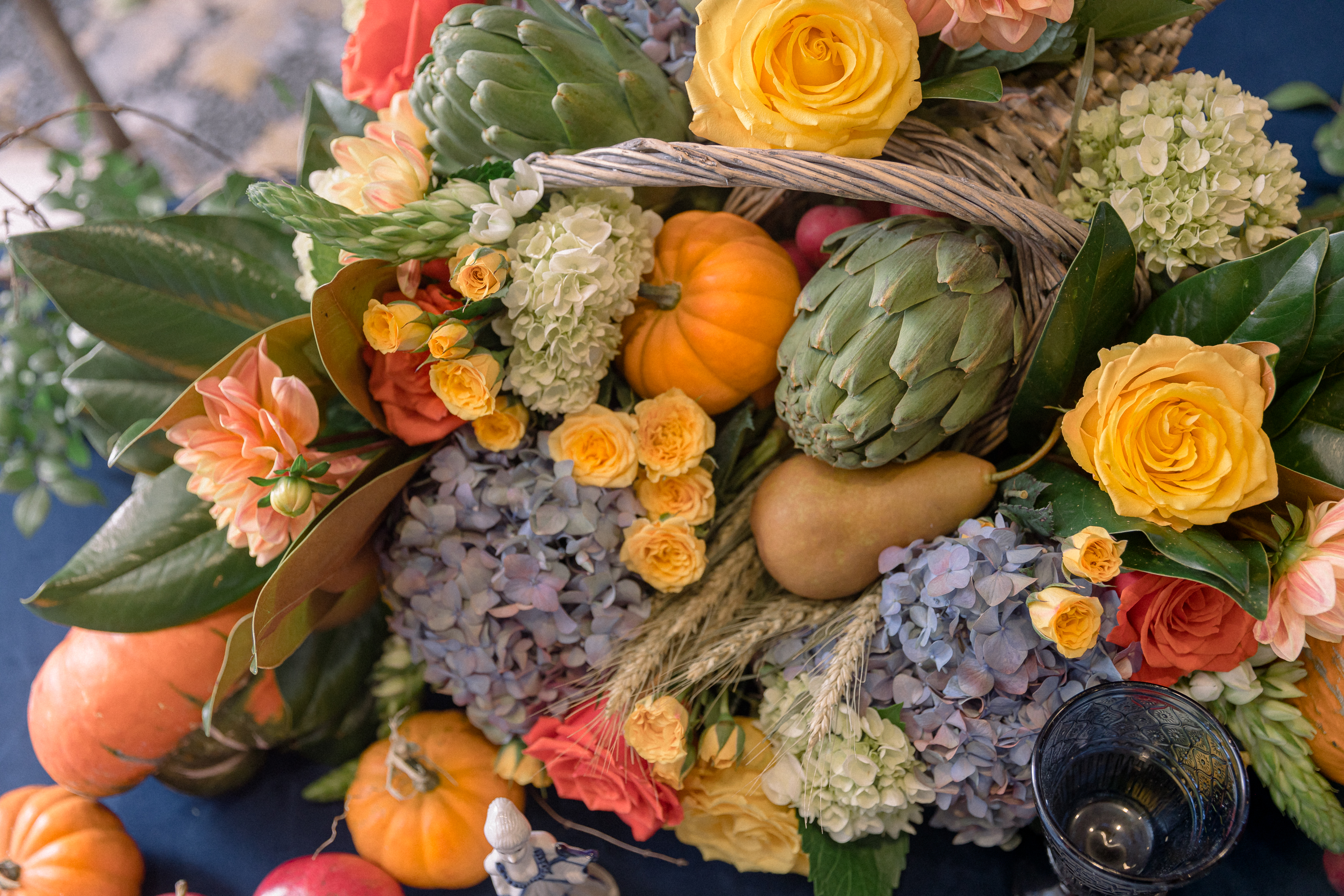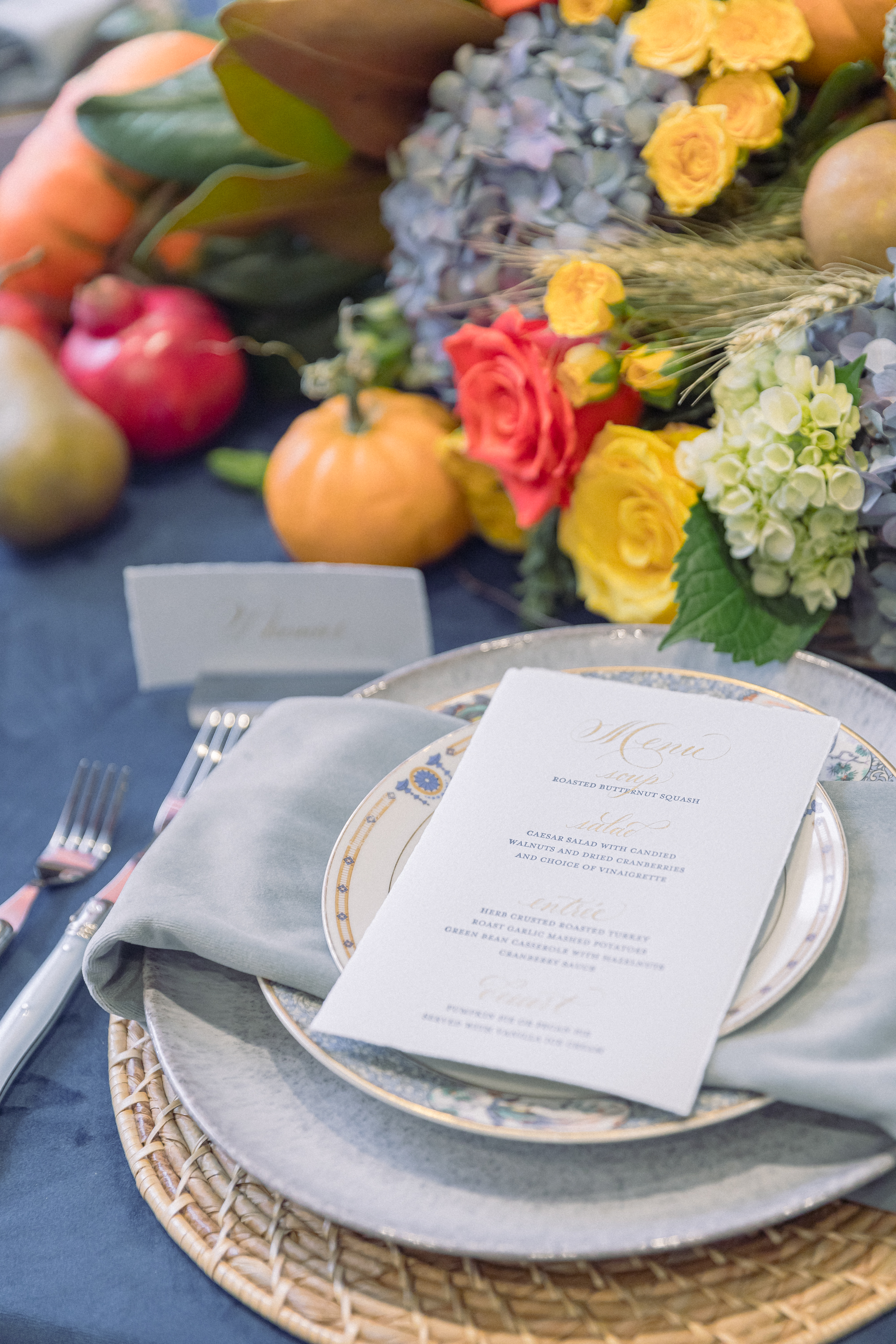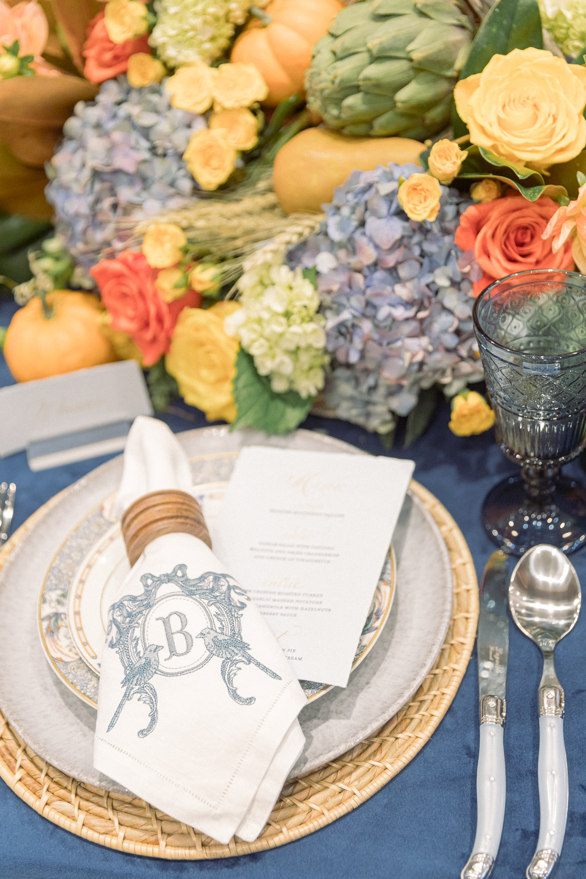 The centerpiece of this table is a cornucopia basket (a Michael’s find) filled with colorful roses and hydrangeas as well as artichokes, pomegranates and other pretty edibles. Copper measuring cups from Rescued Revisions, elegant paper menus from Paperwhite Stationery Boutique, and–surprise!–blue cut-glass stemware from Walmart complete the look.