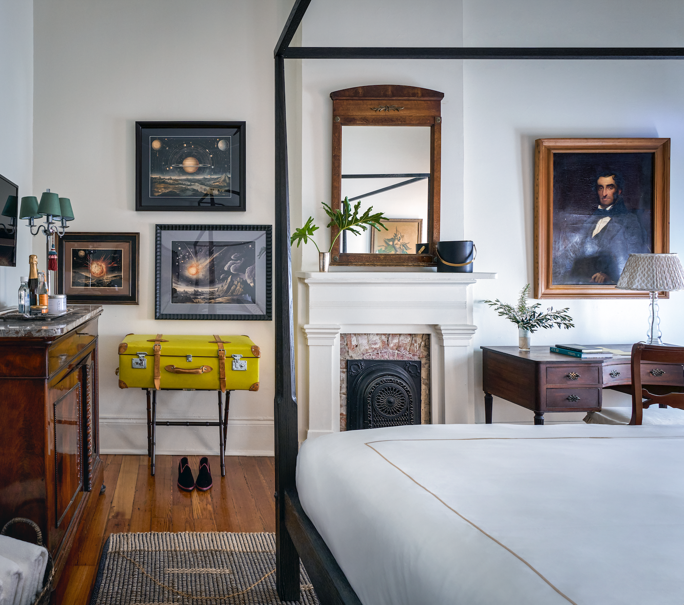 Working with Vieux Carre to ensure the rooms were restored with historic integrity, the millwork and ironwork on in-room fireplaces are original, and antiques found across New Orleans and beyond pull together the design. Unlike in The Chloe, walls in The Celestine are awash in eggshell white, reflecting plenty of natural light and allowing details like a collection of 19th-century oil paintings found in the hotel’s attic to shine.