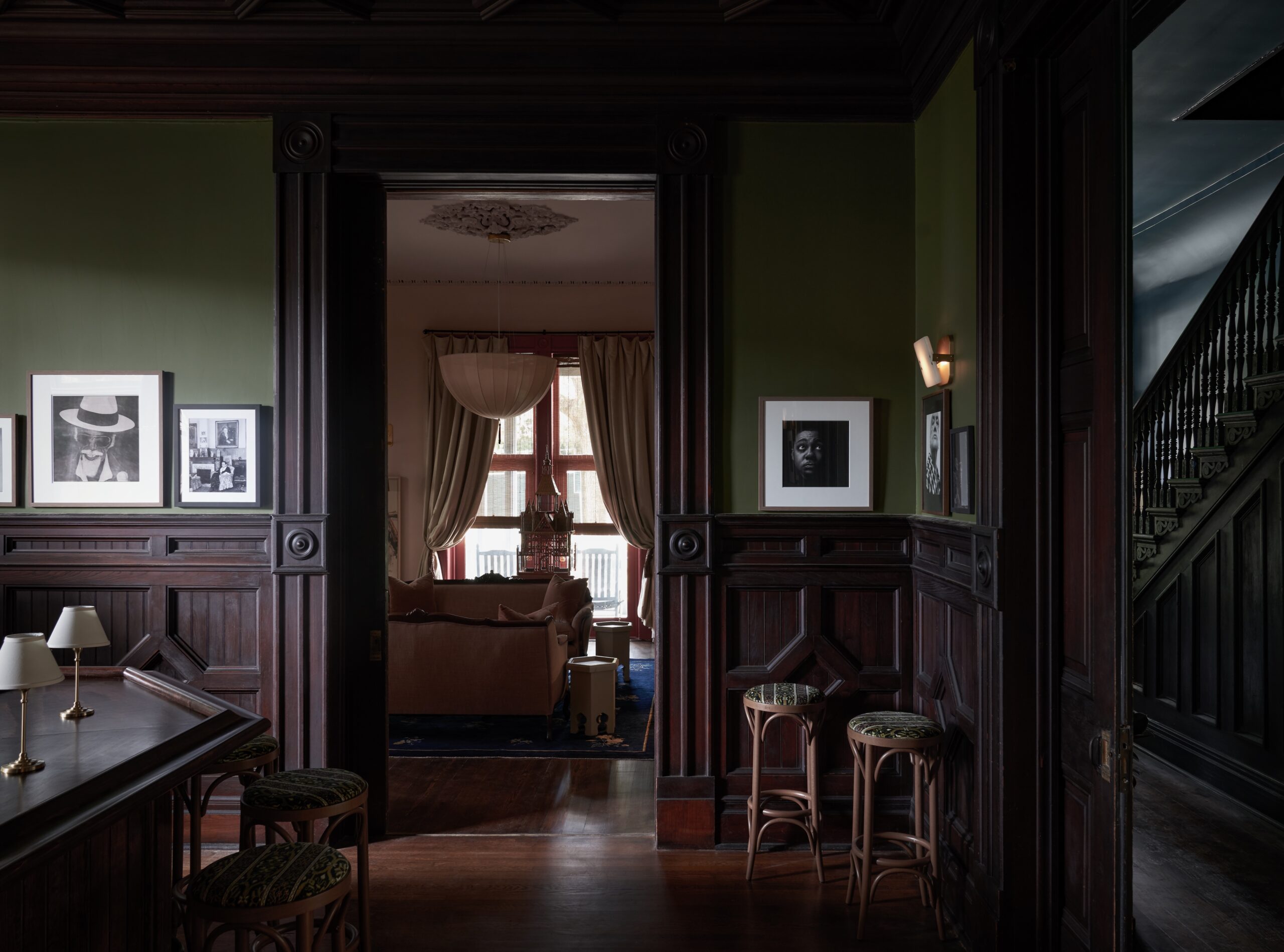 Built into the former home’s parlor is one of The Chloe’s bars. The space’s intricate mahogany wood details and deep green walls are illuminated by plenty of natural light streaming in from the room’s windows. A selection of black and white photography lines the walls.