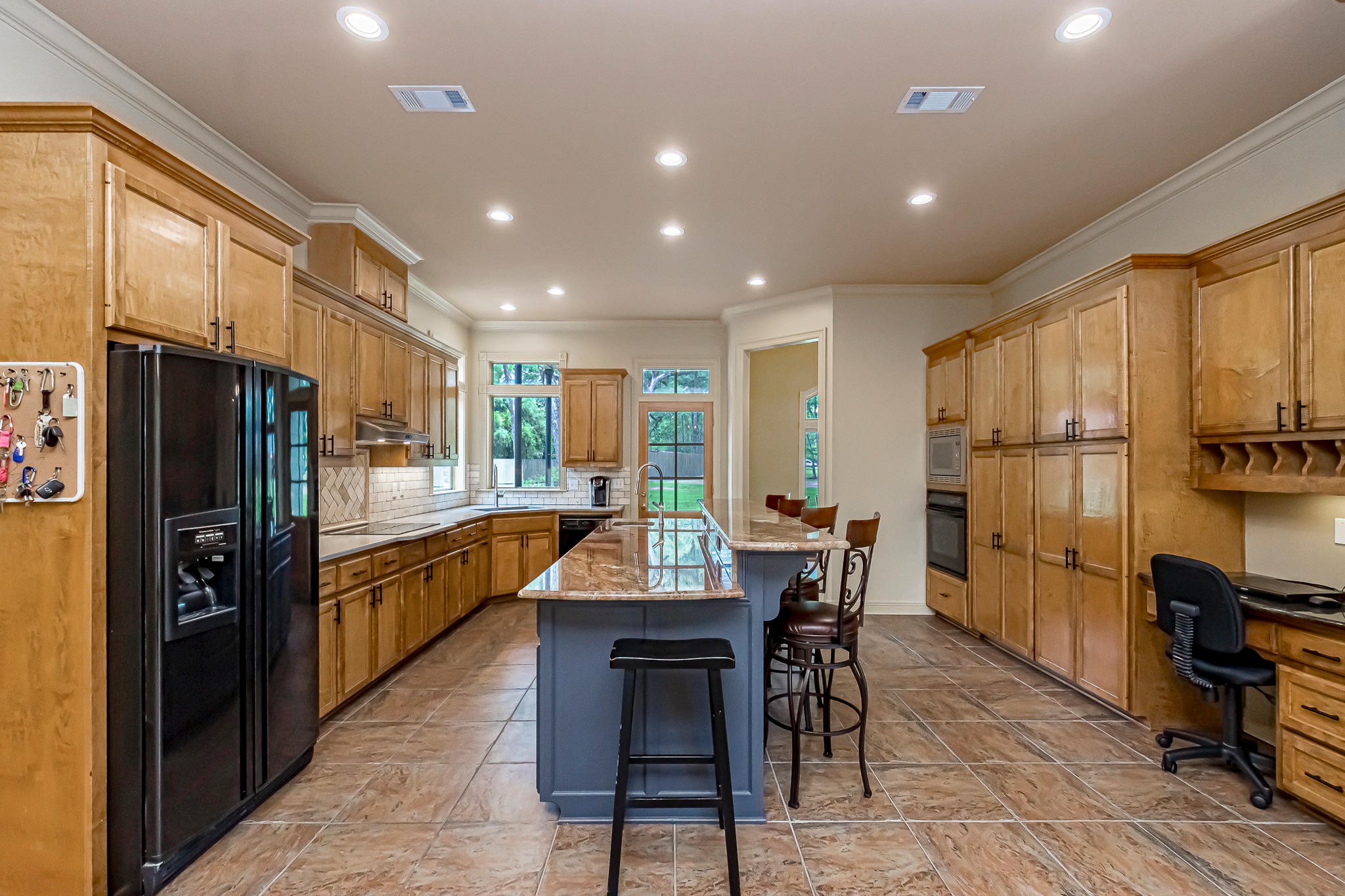 The oversized kitchen features a breakfast area. It is decked out with an abundance of cabinets and appliances, including a refrigerator/freezer, induction cooktop, wall oven and microwave. A large breakfast bar island features a vegetable sink, built-in desk and granite and quartz countertops with tile backsplash.