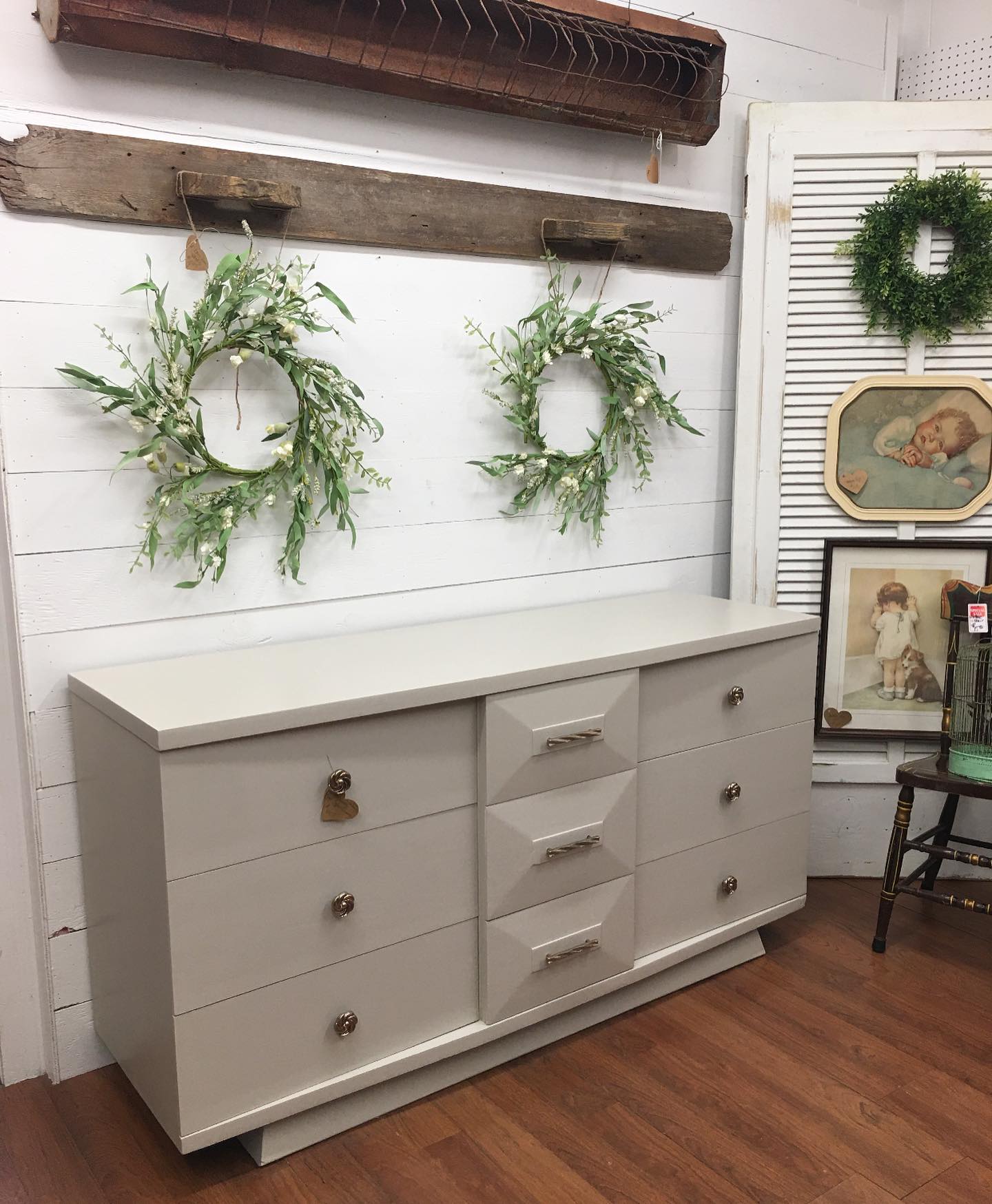When walking into my store, you can expect to see a curated collection of furniture, home décor and antiques. My style often incorporates primitive finds with rustic painted furniture, as well as some modern elements. The large front section of the store houses all of my items, and the back section is divided and rented out to my 10 dealers who have their own styles that blend well with mine. Ultimately, Rescued Revisions has items to fit many different styles.