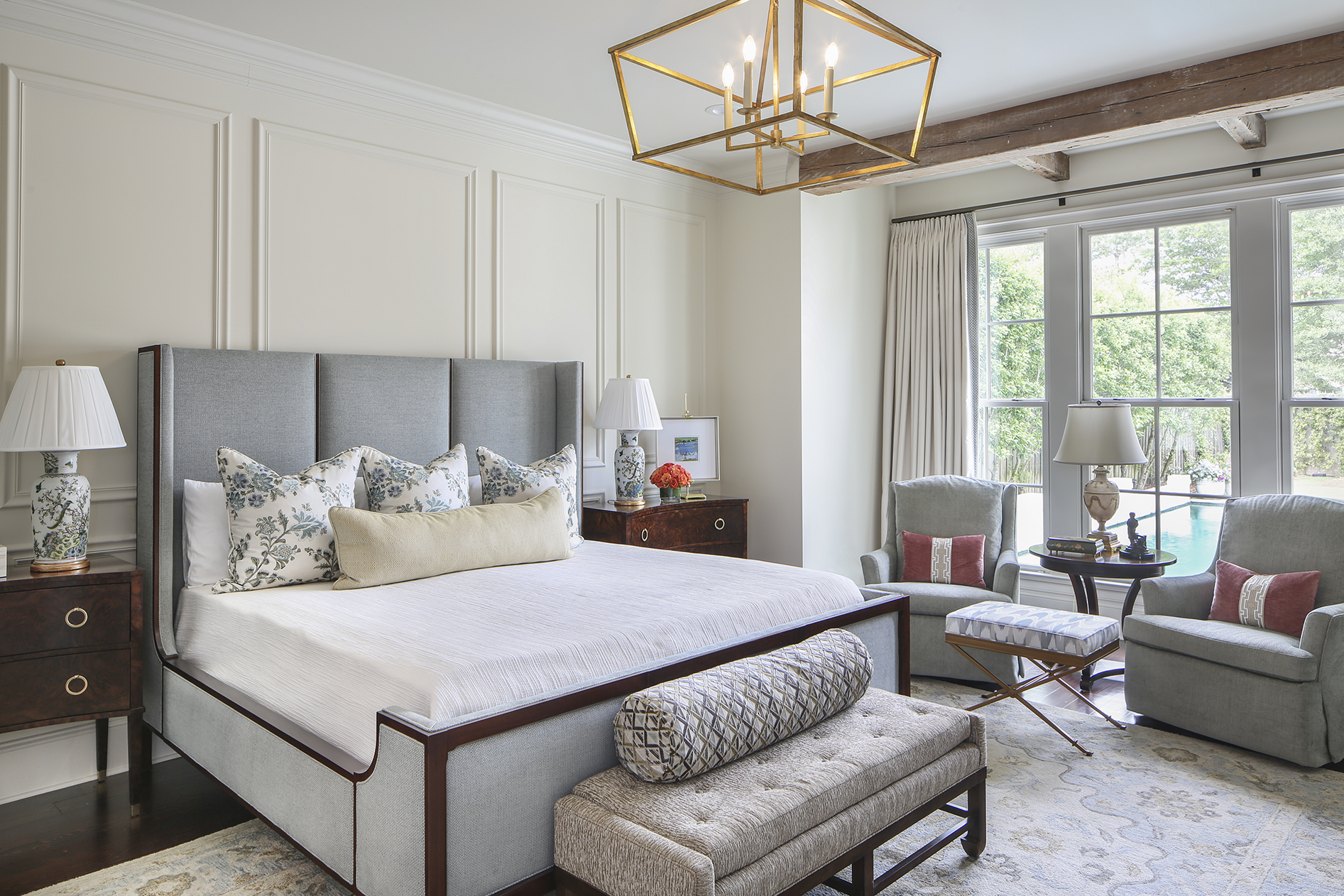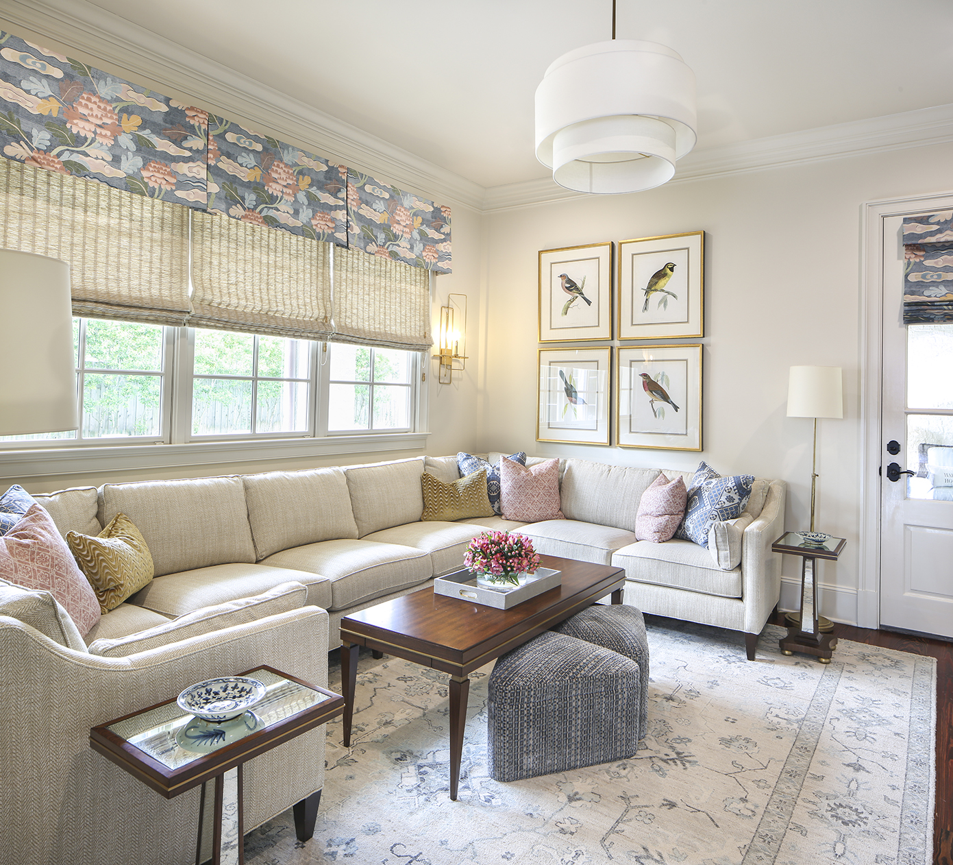 And while each area—from the sitting room off the foyer to the casual lounge towards the back of the house—has its own look and accents, cohesion remains with a wash of Benjamin Moore’s classic favorite “White Dove” throughout the entire home.