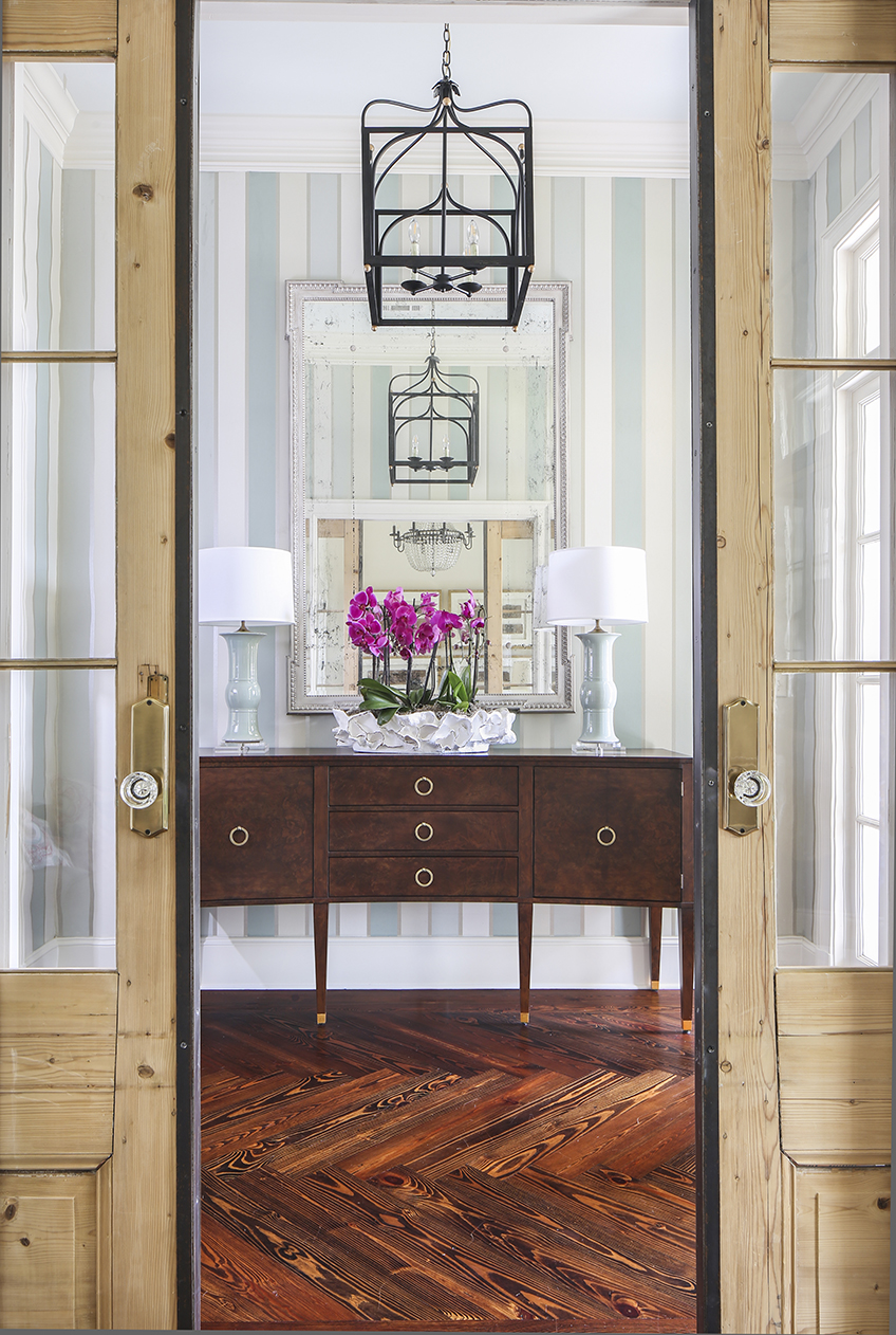 But the biggest impact, Landry says, came from changing the lighting in a majority of the rooms. A crystal chandelier above the kitchen island was changed out for a simpler two-tier fixture. Above the dining table, two brass lanterns illuminate the space and bring continuity with the adjacent kitchen. And in the foyer, an iron pendant grounds light blue striped wallpaper that came with the house.