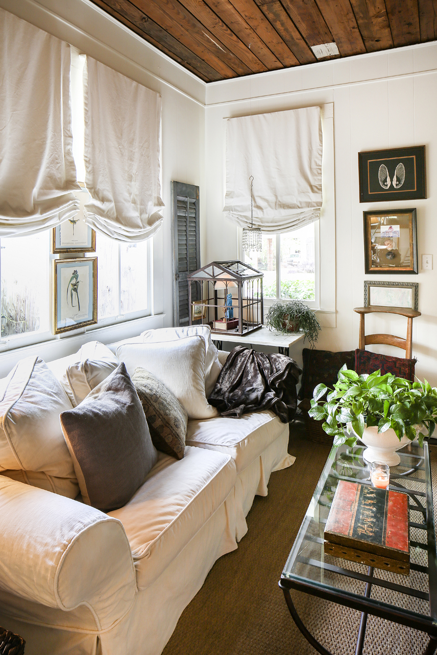 Though guests may choose to linger outside Julie’s front door, one step inside her 1902 house feels like a warm embrace. Wood plank ceilings balance the depth of color on the old wood floors below—painted in Benjamin Moore’s “Black Bean Soup.” Comfortable sofas, sea grass rugs and plenty of plump pillows invite family and friends to curl up and chat. And, in only 1,550 square feet, the cottage offers an intimate setting which Julie appreciates.