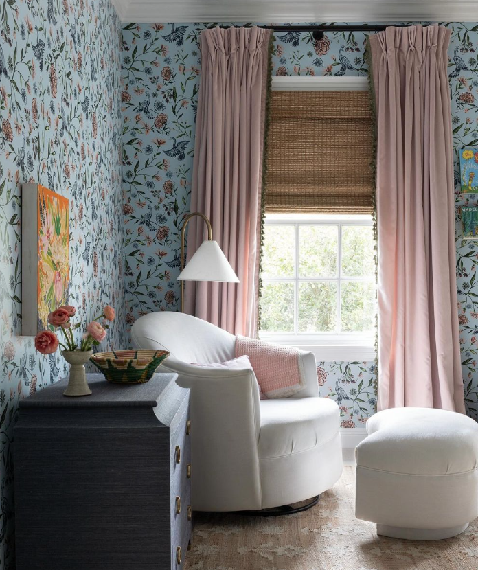 “I love pink and green together, especially these two particular tones,” Collins says. “Rose and sage just naturally work well when paired, much like they do when you see them paired in nature. I also love how the green tassels and pink drapes compliment the green accents of the wallpaper.”