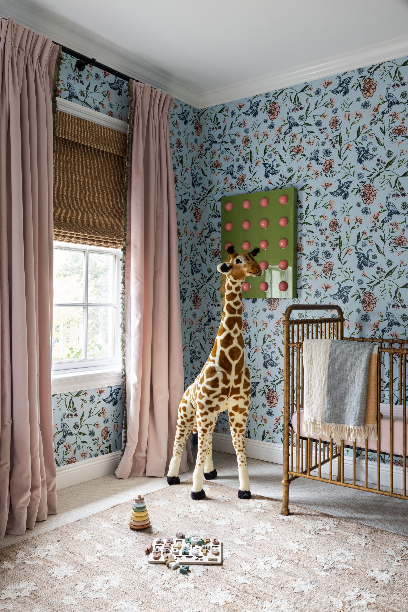 The multicolored wallpaper, made by Pepper Home, is a head-turner in this fanciful nursery. The paper’s detailing is highlighted with flattering color choices and Hattie’s signature giraffe.