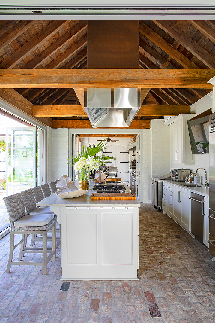The master bath was the focal point of a major makeover that saw its shower reconfigured and its dark marble surfaces replaced by pale materials that fit the coastal vibe. The indoor kitchen was lightened up with new quartzite countertops and a mother-of-pearl backsplash, along with a new rock crystal-accented chandelier above the island, and observant visitors immediately notice Wayne’s collection of homemade spice blends tucked into open shelving beside the range hood.
