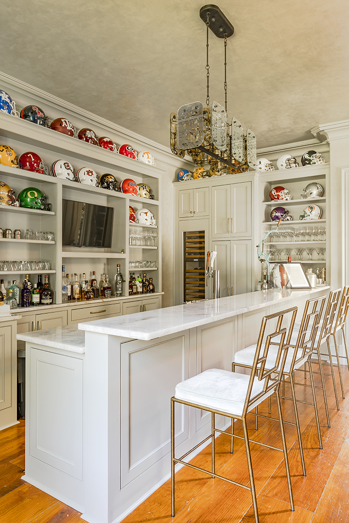 What once was a study across the entry hall from the dining room became a functional bar with designer touches including open-frame geometric stools from Anne’s store, Texture, and new custom cabinetry accented by hammered hardware. But the bar space is as playful as it is pretty, with rows of colorful helmets from college football teams displayed on high shelves and a custom neon “Stabiler’s Tavern” sign on the opposite wall.