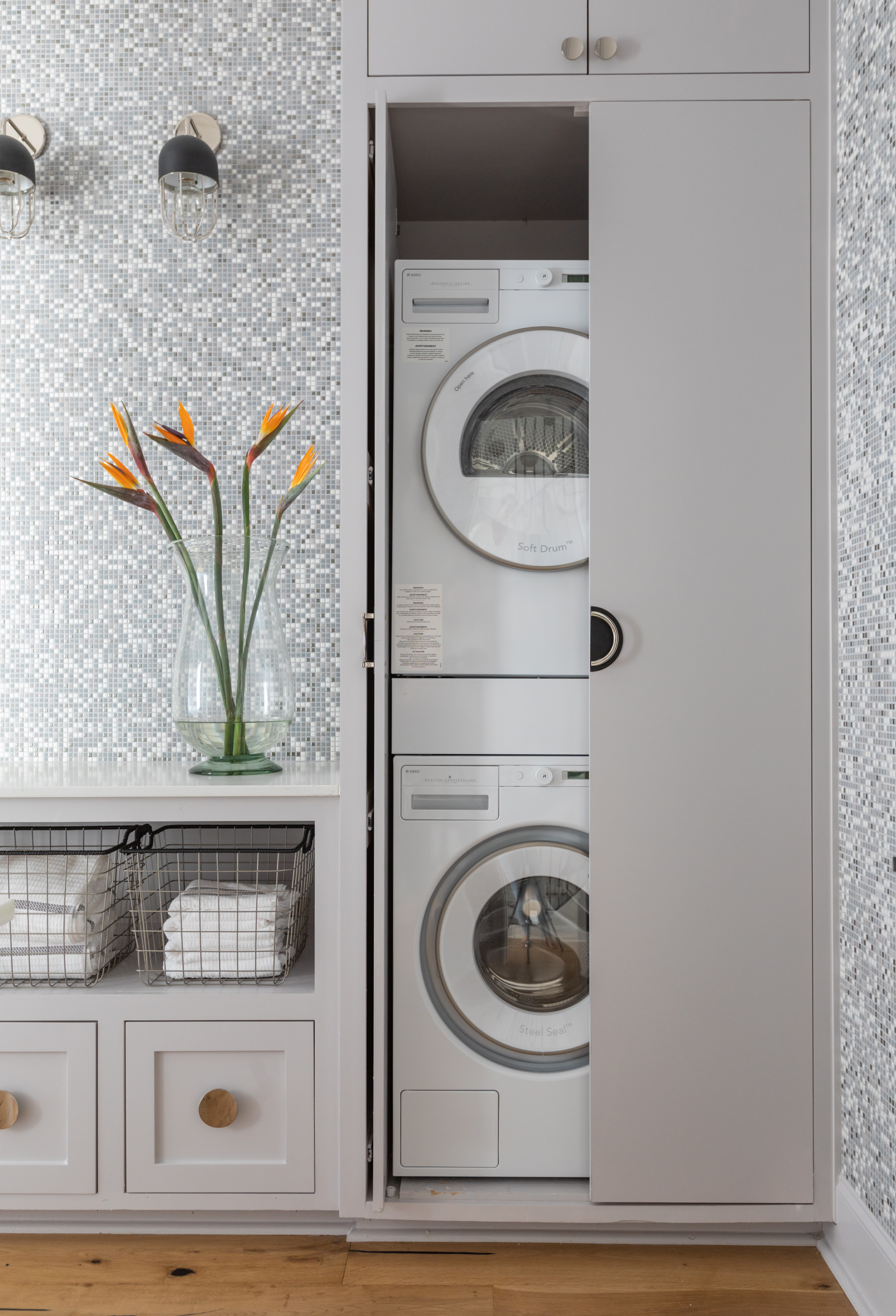 The master bath was the site of one of the home’s most dramatic overhauls, with the positioning of plumbing reimagined and walls removed. Here, a floating vanity with a tall glass-encased-fabric backsplash by Sicis is flanked by the new shower—complete with Mr. Steam steam shower system—and tub. The tub and sinks are by Villeroy & Boch, and all faucets are by Brizo.