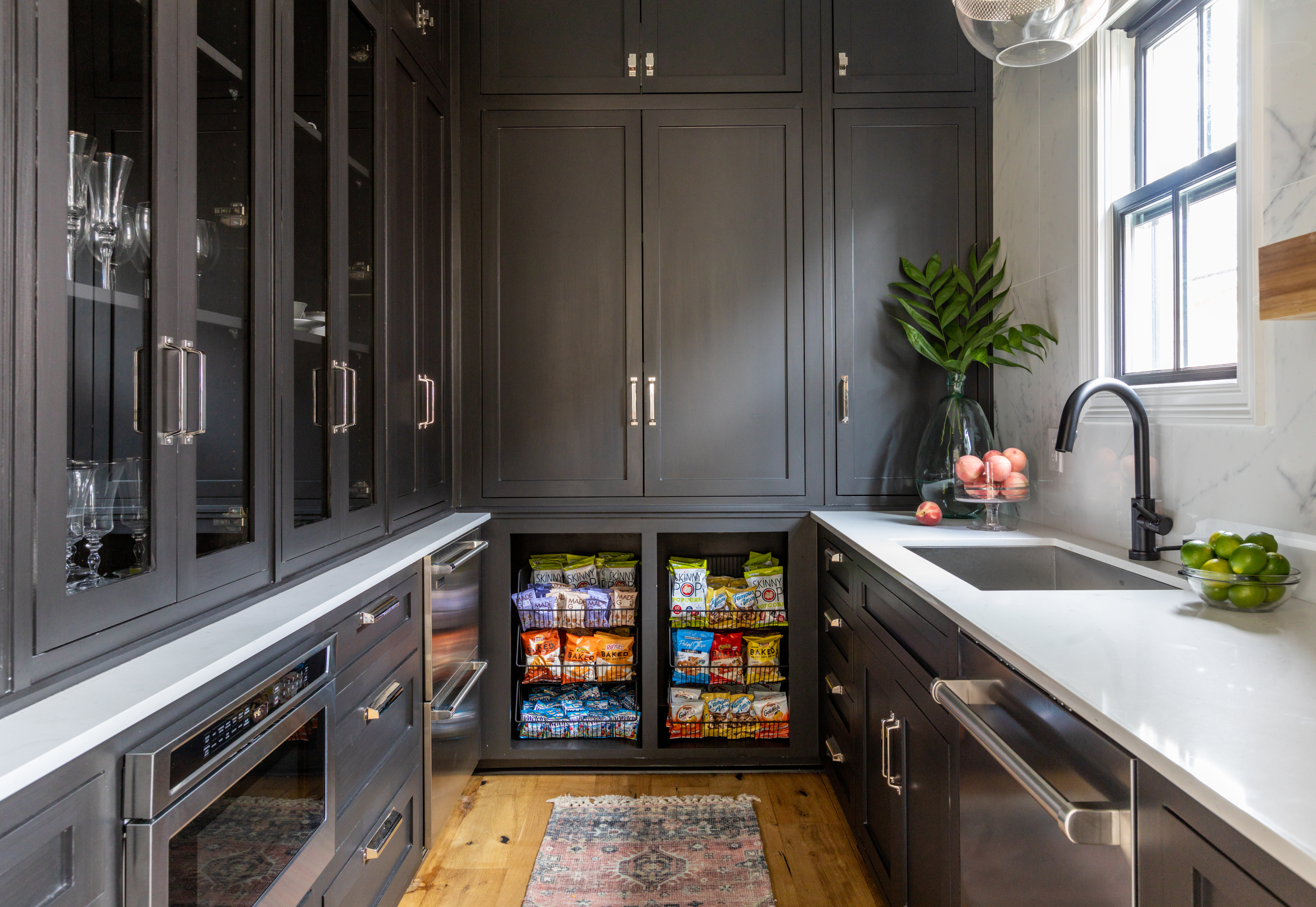 “This space is designed to entertain,” Bellizaire says. “We’ve got the huge prep sink here and another sink in the pantry, and there’s a second dishwasher in there as well. And the aisle between the island and the cabinets is wide enough for more than one person.”