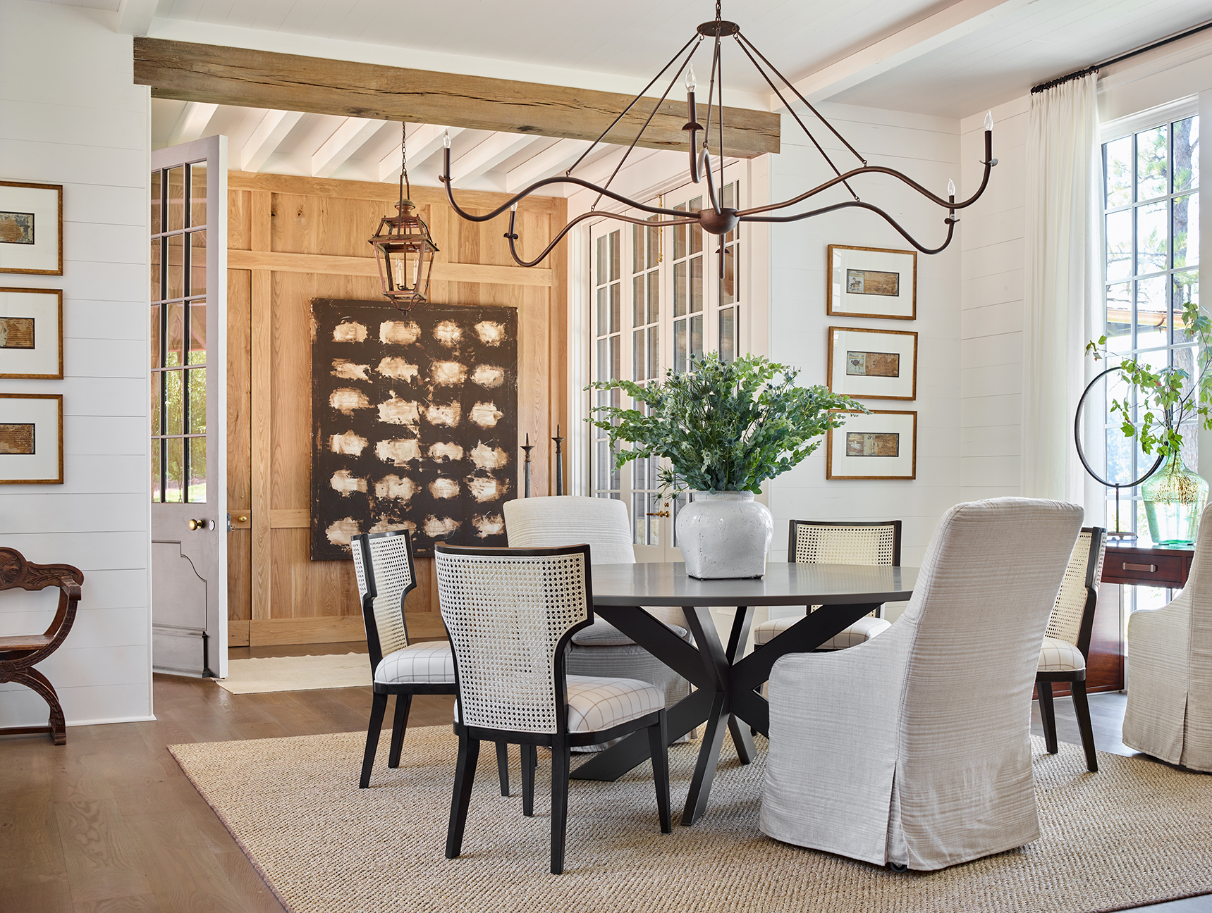 Gilbreath tells us she was tasked with “taking what you see outside those windows” and making it feel connected to the indoor environment, while also creating coziness and practicality to suit a family with grown children and young grandchildren all gathering on weekends. “They wanted to be able to have fun and not have to fuss over who has a muddy swimsuit or who’s dripping water into the house,” she says, adding that blending those hardy materials with a few antique pieces helped to give the house a sense of history that defies time. “They just really wanted it to be very family friendly and at the same time something that could be passed on to the next generation.”