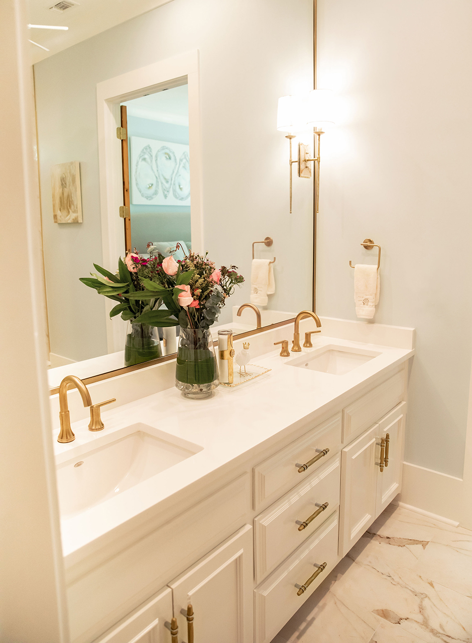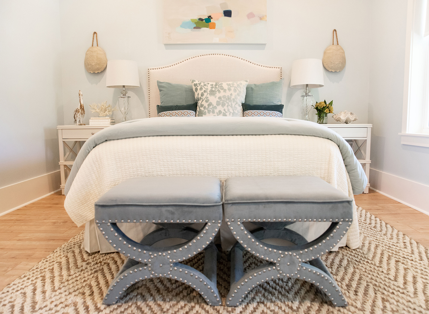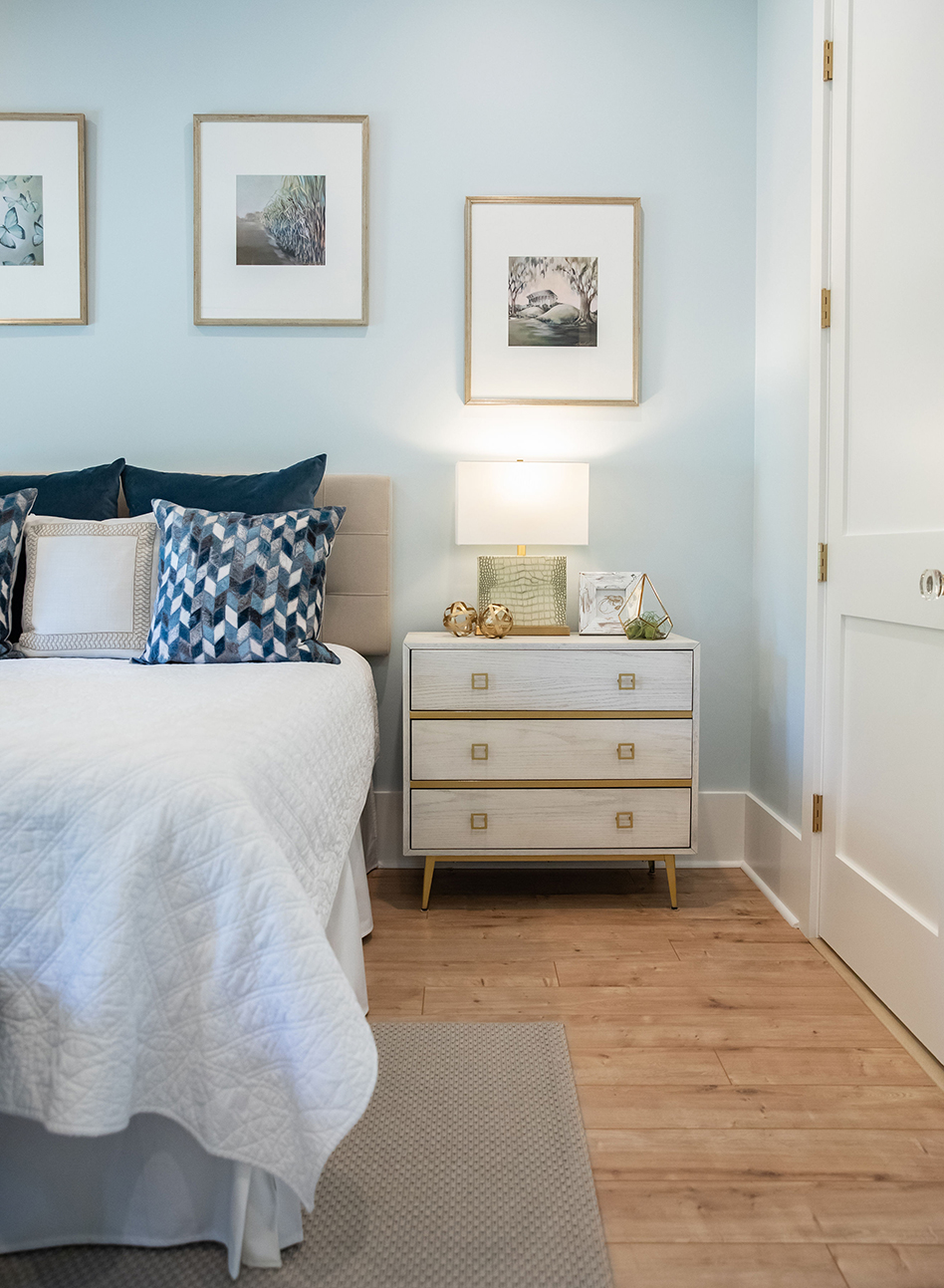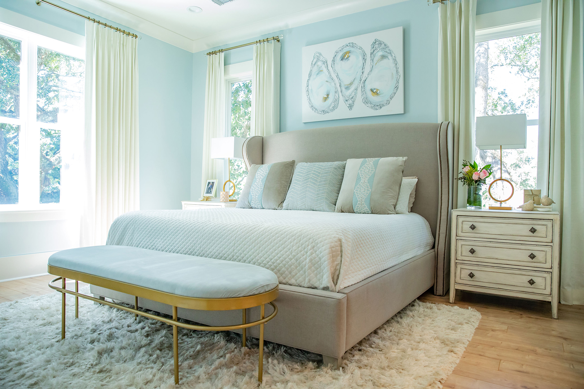 Shades of blue carry throughout the house, with different tones giving each space its own unique vibe. In the master bedroom, touches of velvet and gold mix with pastel blue shades for a soft and sophisticated look. Across the hall, a colorful canvas by Baton Rouge artist Jennifer Poe and touches of turquoise allow one of the guest rooms to come off a little more casual and whimsical.