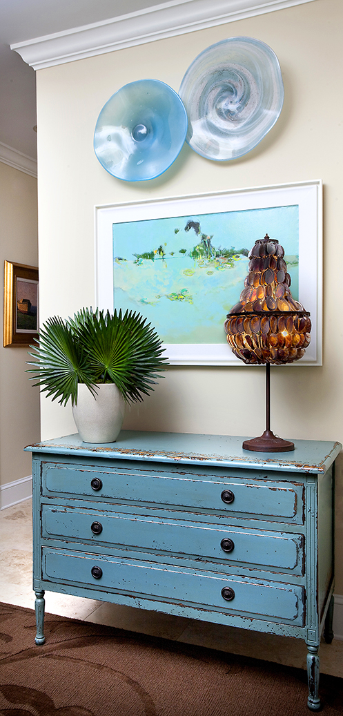 After selecting the vibrant fabrics, the next step in the design process was to layer in textures—seagrass rugs, rattan and bamboo furnishings, shimmering shell lampshades. Finishing touches came in the form of an abundance of artworks by Louisiana artists, including multiple pieces by Lisa DiStefano, who is a friend of the homeowners.
