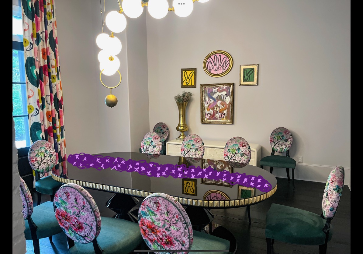 From a concept drawing to the finished product, the lavender-hued hydrangeas, Ocean Song roses, and carnations immediately draw the eye to the black lacquered dining room table while playing off of the wall color, chair upholstery and, most importantly, the butterfly-covered Hunt Slonem painting on the back wall. However, while the arrangement was made for pictures, the concept is still rooted firmly in reality, as Glover notes that a centerpiece like this is ideal for a dinner party since it is low to the table, allowing guests to easily see and talk with one another.