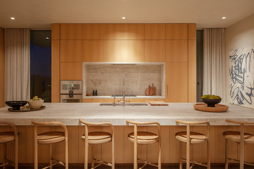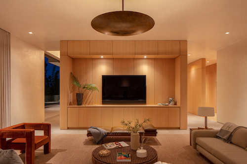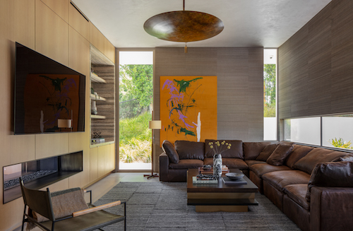 For Rousseau, the interior of the home is most appealing. The wood accents on furniture, he notes, pair well with the home’s other natural elements like leather on the sofa and the soft textured rug. “The house is a grand statement using a lot of concrete, steel and glass,” Rousseau says. “So the wood helps to bring the scale of things down to a more human scale.” Incorporating pops of color in abstract artwork also helps direct visual interest in this otherwise monochromatic room.