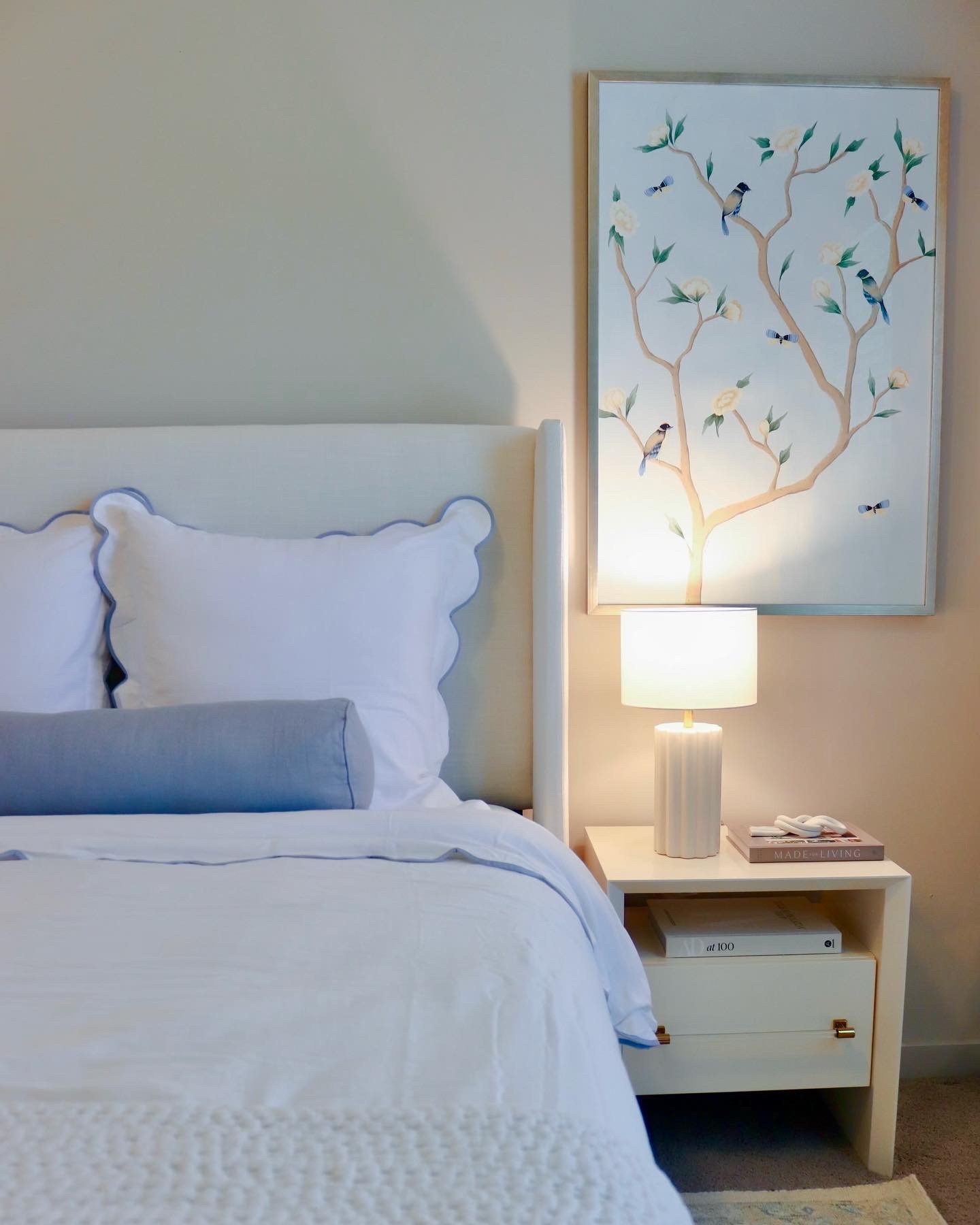 Birds, butterflies and baby blue hues create a calming bedroom retreat