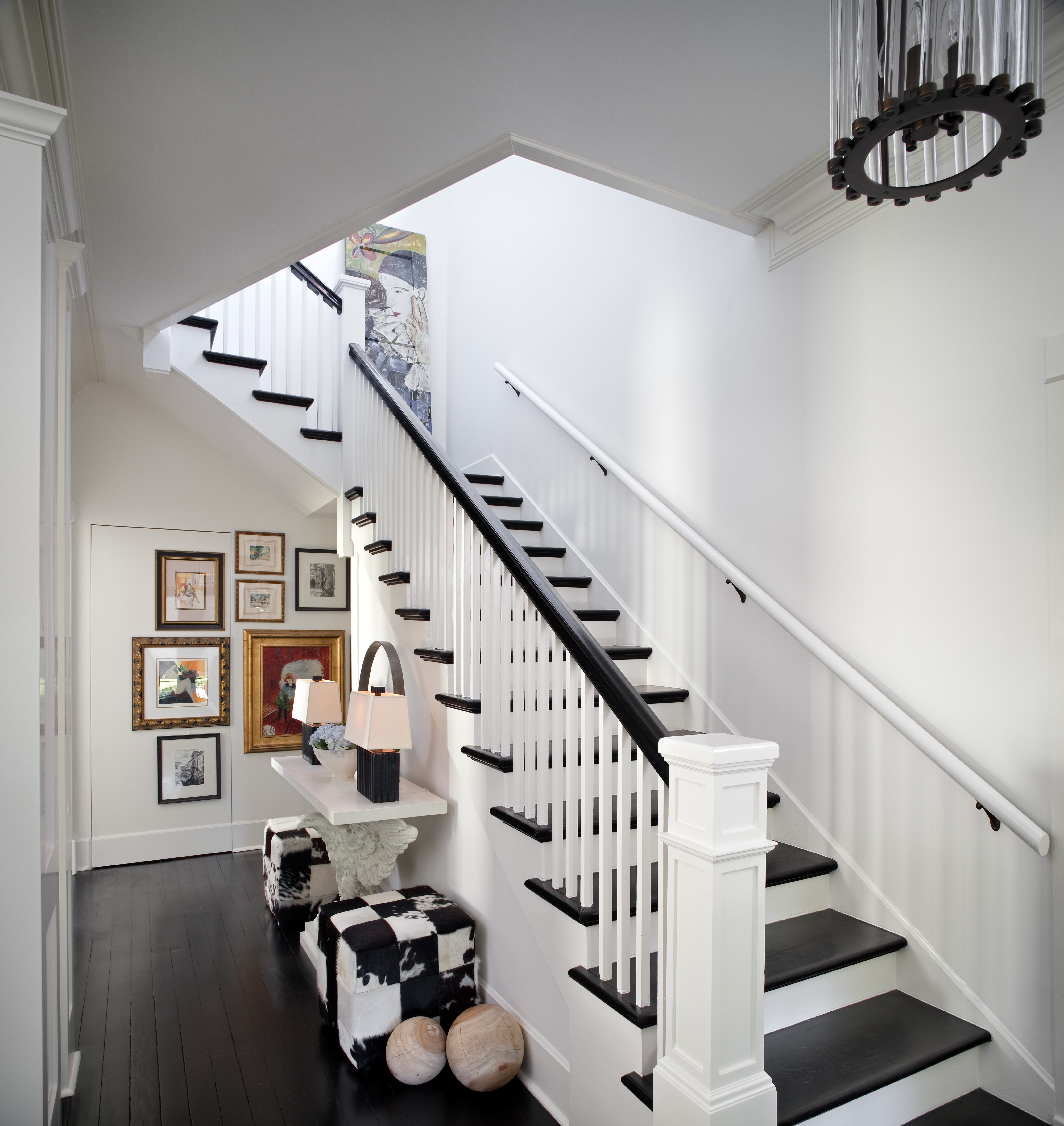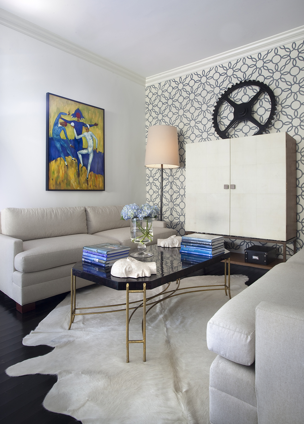 Another goal of the redesign project was to better showcase the couple’s extensive collection of Louisiana art, which Larkins says “somehow did not live up to its full potential” within their existing décor. He started by painting walls in a crisp white—Benjamin Moore’s “White Dove”—to offer a gallery-like backdrop for paintings. To heighten the drama, the original wood floors were stained in a nearly black Jacobean shade.
