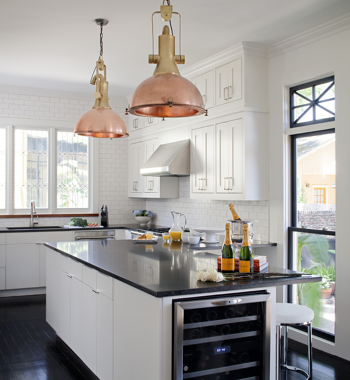 The room retains the overall black and white palette but with an unexpected infusion of warmth from a pair of custom copper and brass hanging light fixtures. “They had copper pots before,” says Larkins. “This gives them that same feeling but in a more interesting way.”