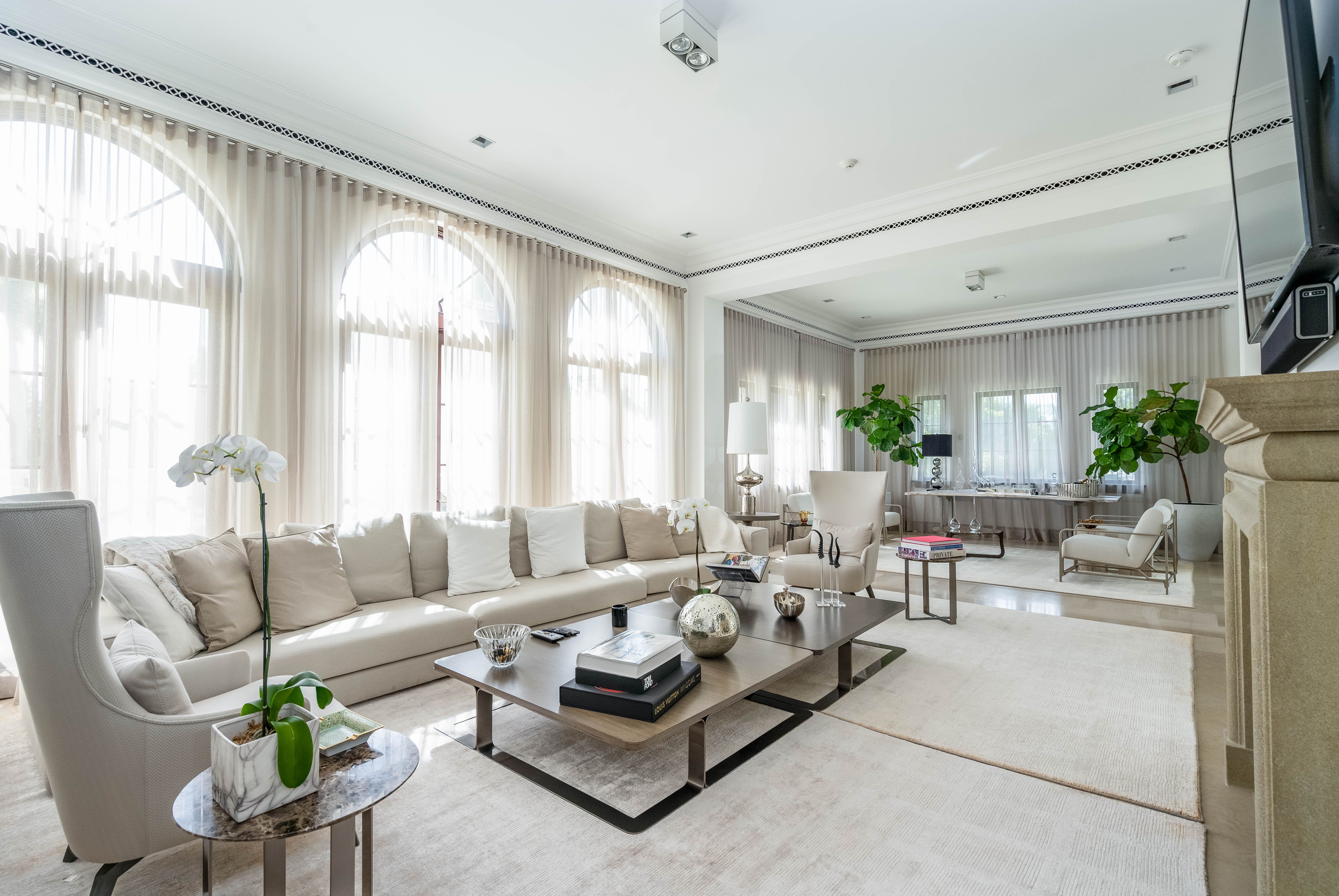 At 20,546 square feet, Anthony’s mansion is one of the largest homes in south Florida, featuring 12 bedrooms and 13.5 baths, three kitchens, a wine cellar, separate staff quarters, and an elevator to all three floors. We reached out to Shannon Mahon of Shannon Mahon Interiors looking for a local perspective on the design of the main living space of the mansion.