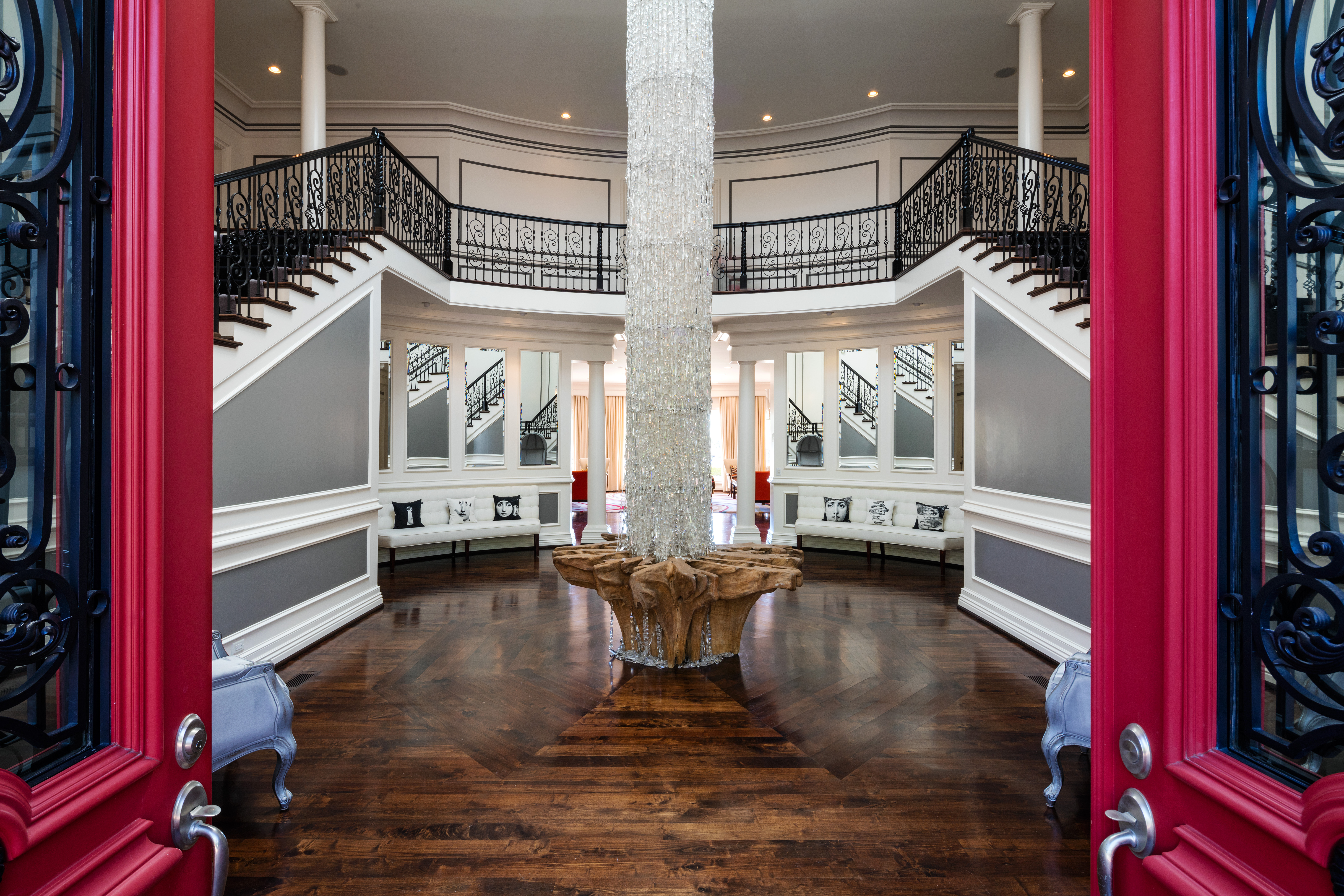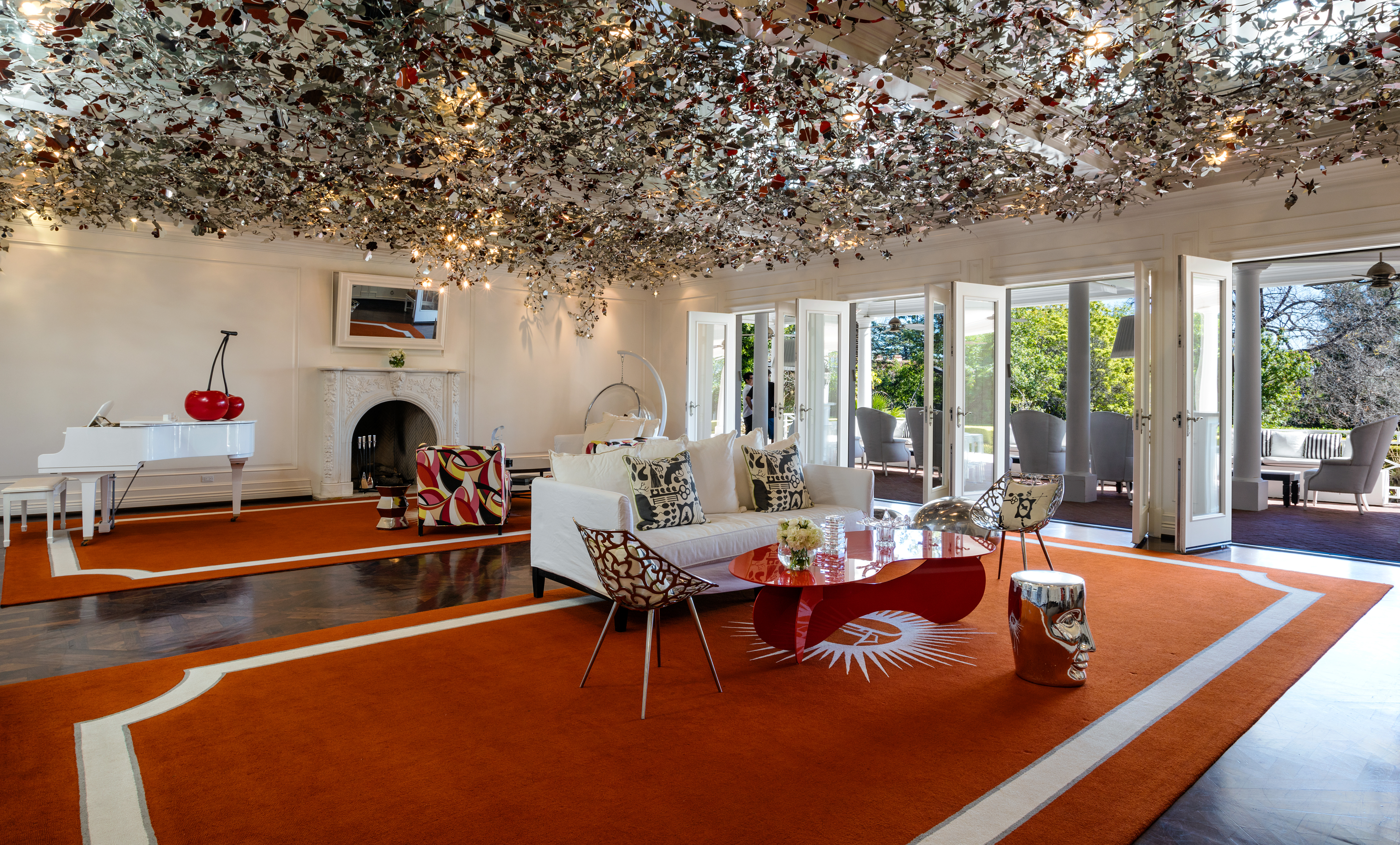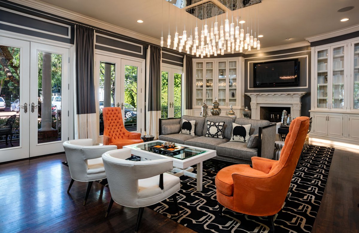 “This room is daring, vibrant and definitely party ready,” says Colleen Waguespack of Colleen Waguespack Interiors. “The high-gloss lacquer elements like the piano and coffee table really glam it up, and of course the ceiling is a showstopper in itself.”