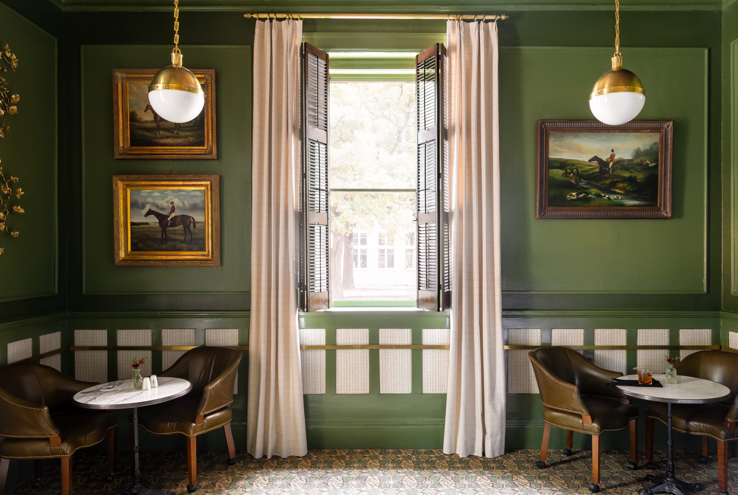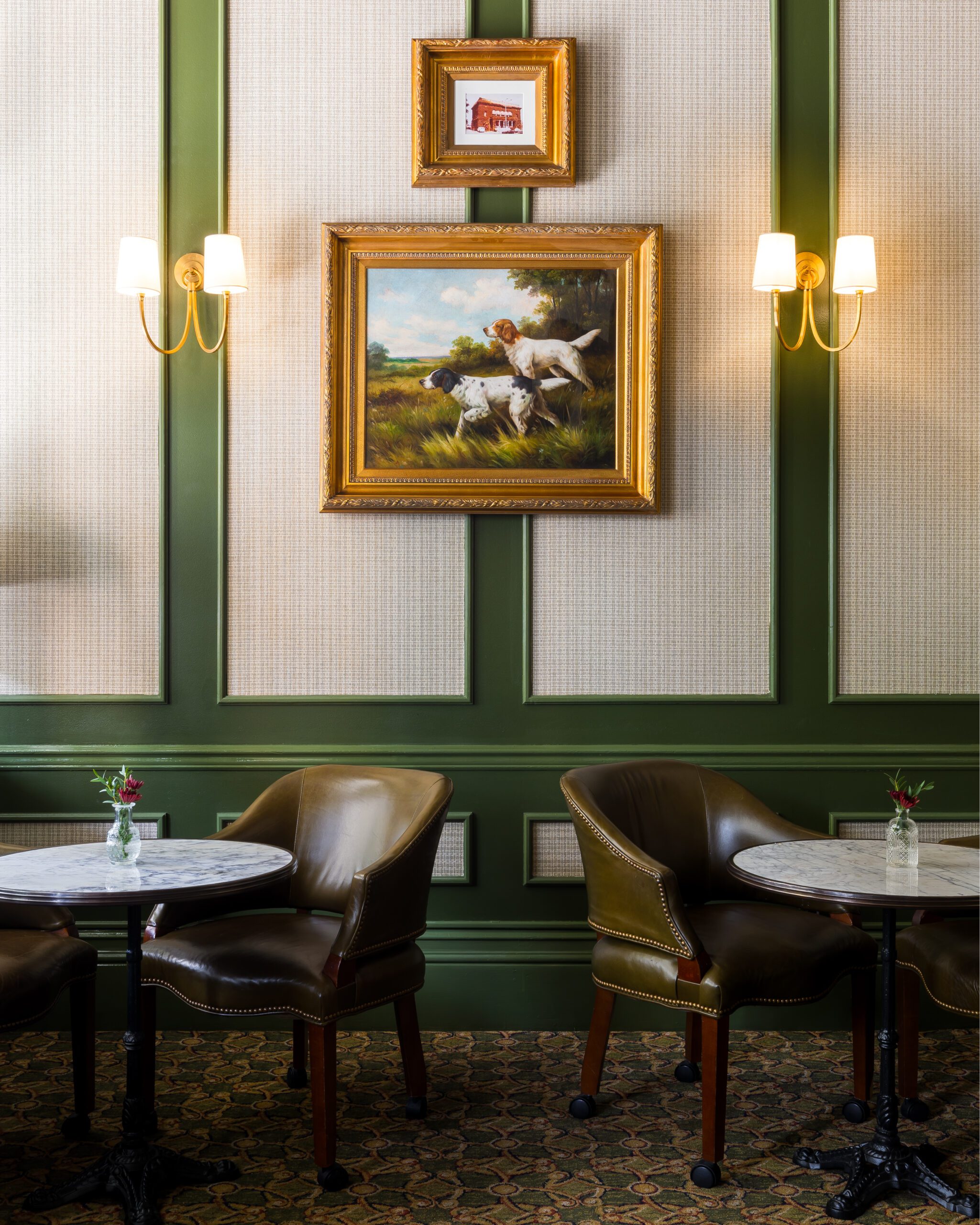 The classic feel of The Polo Bar by Ralph Lauren in New York City served as inspiration for the third-floor lounge as Dellocono worked to incorporate the existing green plaid carpet. From the glossy green subway tile that makes up the bar backsplash to the faux leather paneling on the walls, the carpet’s deep hues are drawn upward in unexpected ways as different textures add layers of interest. A collection of plush furniture pieces and plenty of antiques complete the space, while the original arched ceiling—designed to mimic a train car—remains the star overhead.