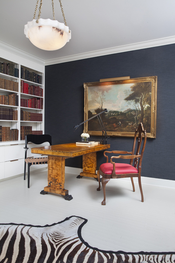 Larkins worked with the homeowners to blend their fine French pieces with more modern items for what he calls “an interesting dialogue and tension.” Streamlined seating pieces now pair perfectly with delicate tapestries; ornate gilded mirrors share space with bold light fixtures. In the dining room, Larkins pulled in the pair’s existing antique table, but he convinced them to donate the matching chairs in favor of comfortable contemporary seating.