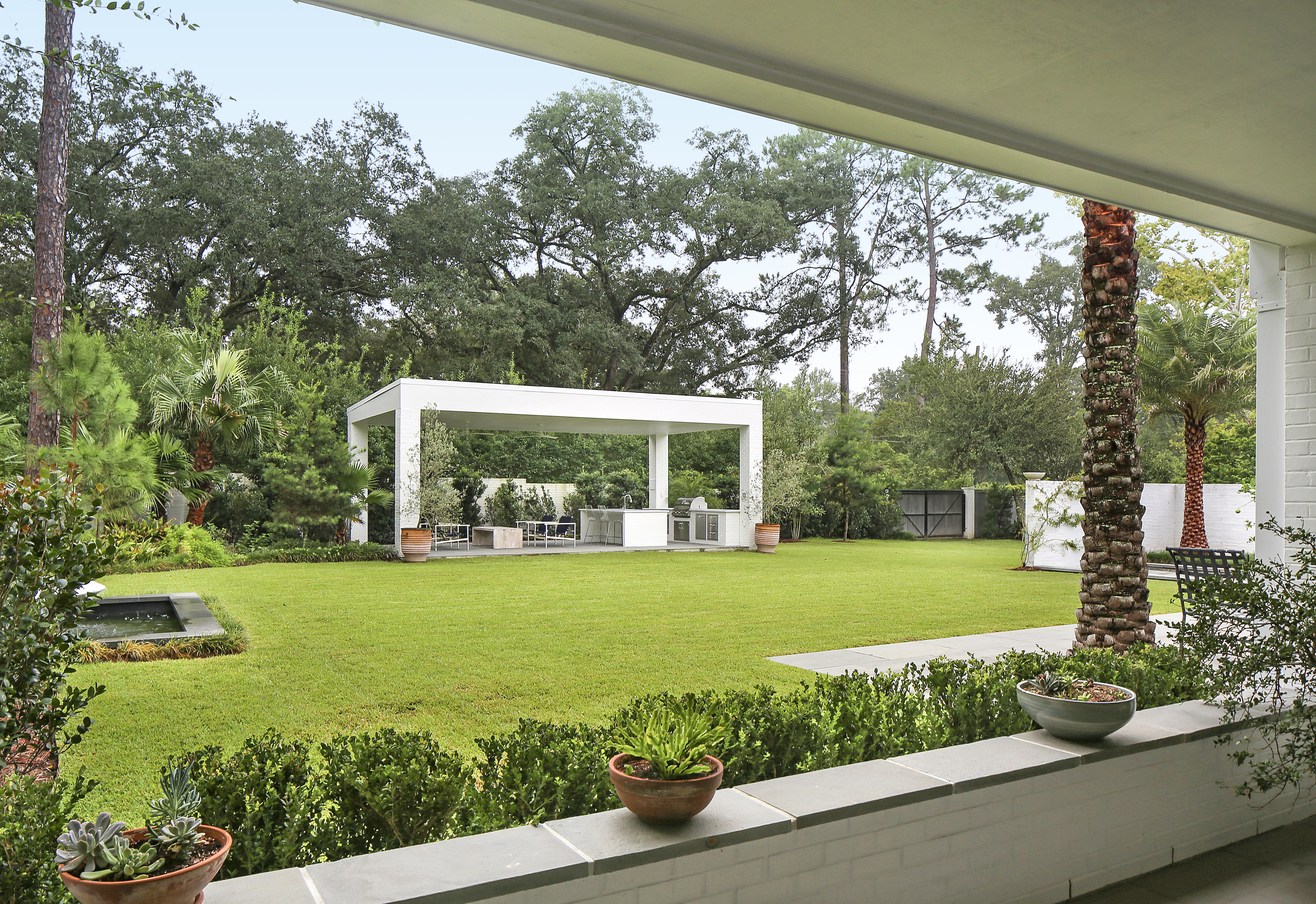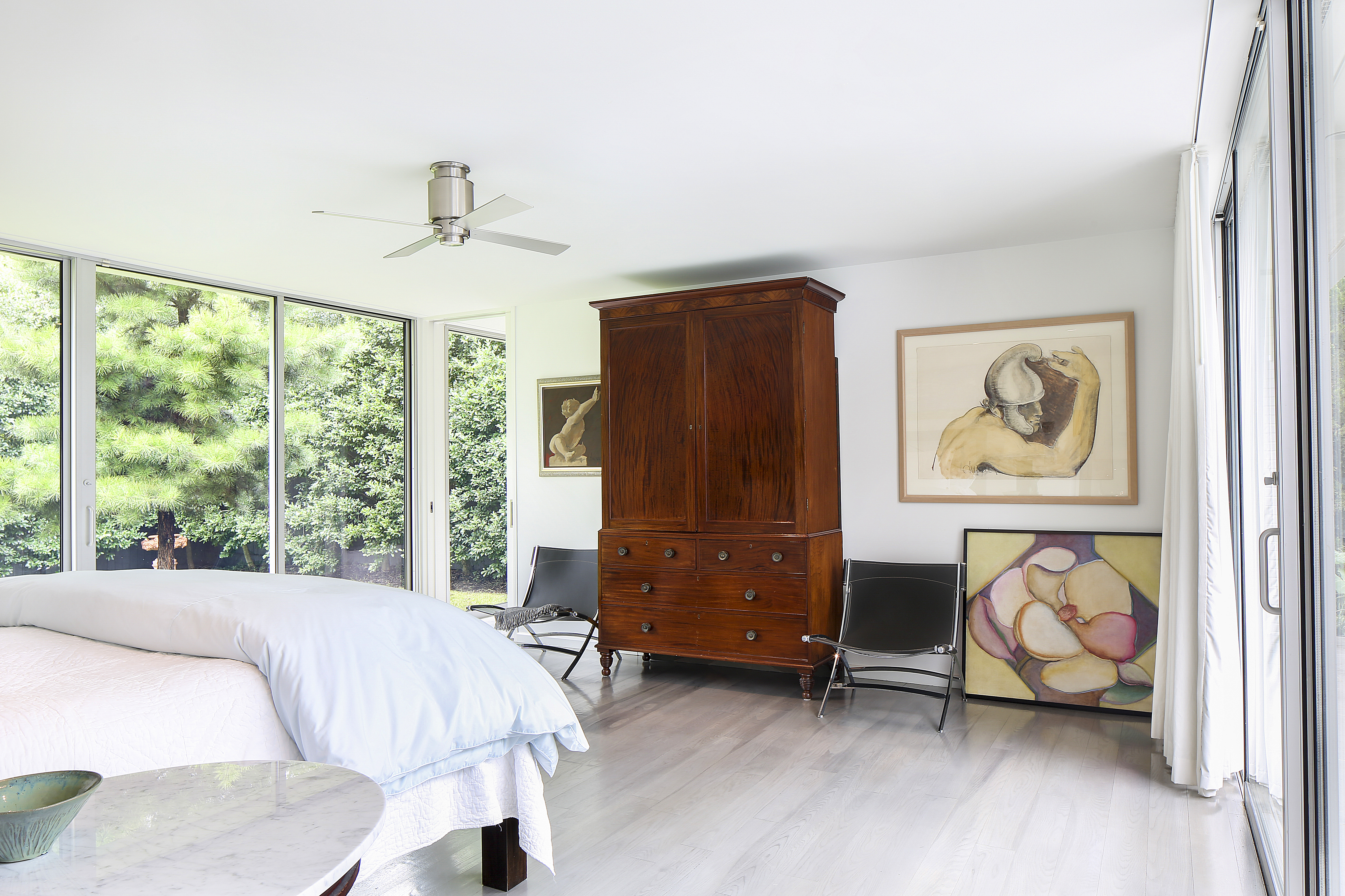 Instead, Price and Jim extended a tall brick wall around the property and personally planted trees and landscaping to enclose the glass house into a private retreat. They recently added an outdoor kitchen that mimics their interior sensibility and style. Now during many cool evenings in the fall and the spring, they can be found outside with the glass doors open to the elements.