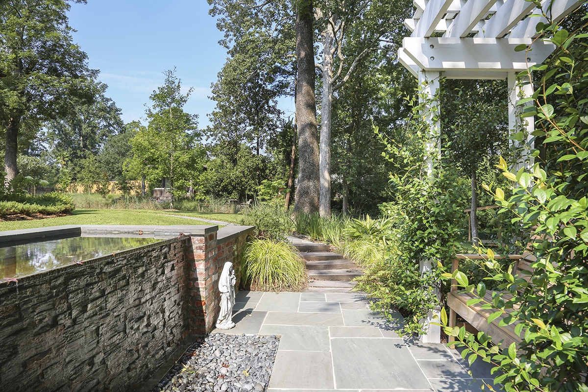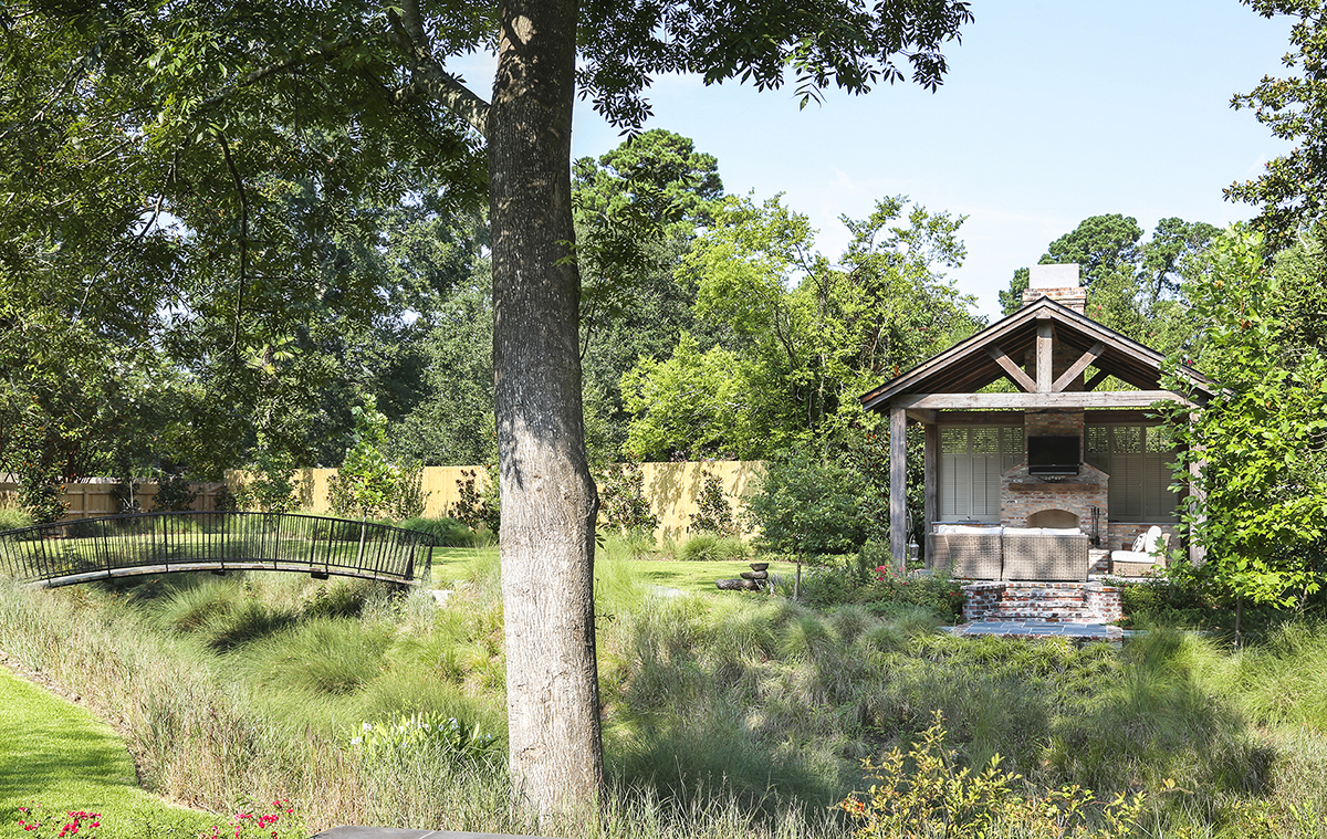 Finally it was time to select a landscape architect, since taming the jungle-like lot was as important as what was happening on the home’s foundation. Justin Lemoine of ELS Landscape Architecture Studio joined the team and devised a plan for making the most of the property’s slopes and valleys—a plan that included meandering paths, newly carved-out streams, a reimagined ravine, a pavilion, a firepit seating area, and a play area, all within the side and rear yards. A favorite spot for the grandkids so far has been the playset that to the unsuspecting observer resembles a woodpile but is carefully arranged and secured to ensure safety and plenty of fun. Bonnie’s prayer garden was positioned in a precise spot where its blooms are visible from the kitchen windows. The renovated ravine was planted with hundreds of specimens of new native grasses, along with “one beautiful butterfly lily that survived” from the land’s former life.