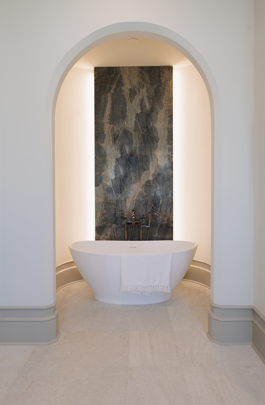 The arch isn’t the only element that helps to create a cohesive look throughout the home, though. The halo of light that shines from the sides of the vaulted ceiling is carried into the home’s library and primary bath, where back- and uplighting are utilized to give the feeling of intimacy, while also illuminating otherwise dark spaces.