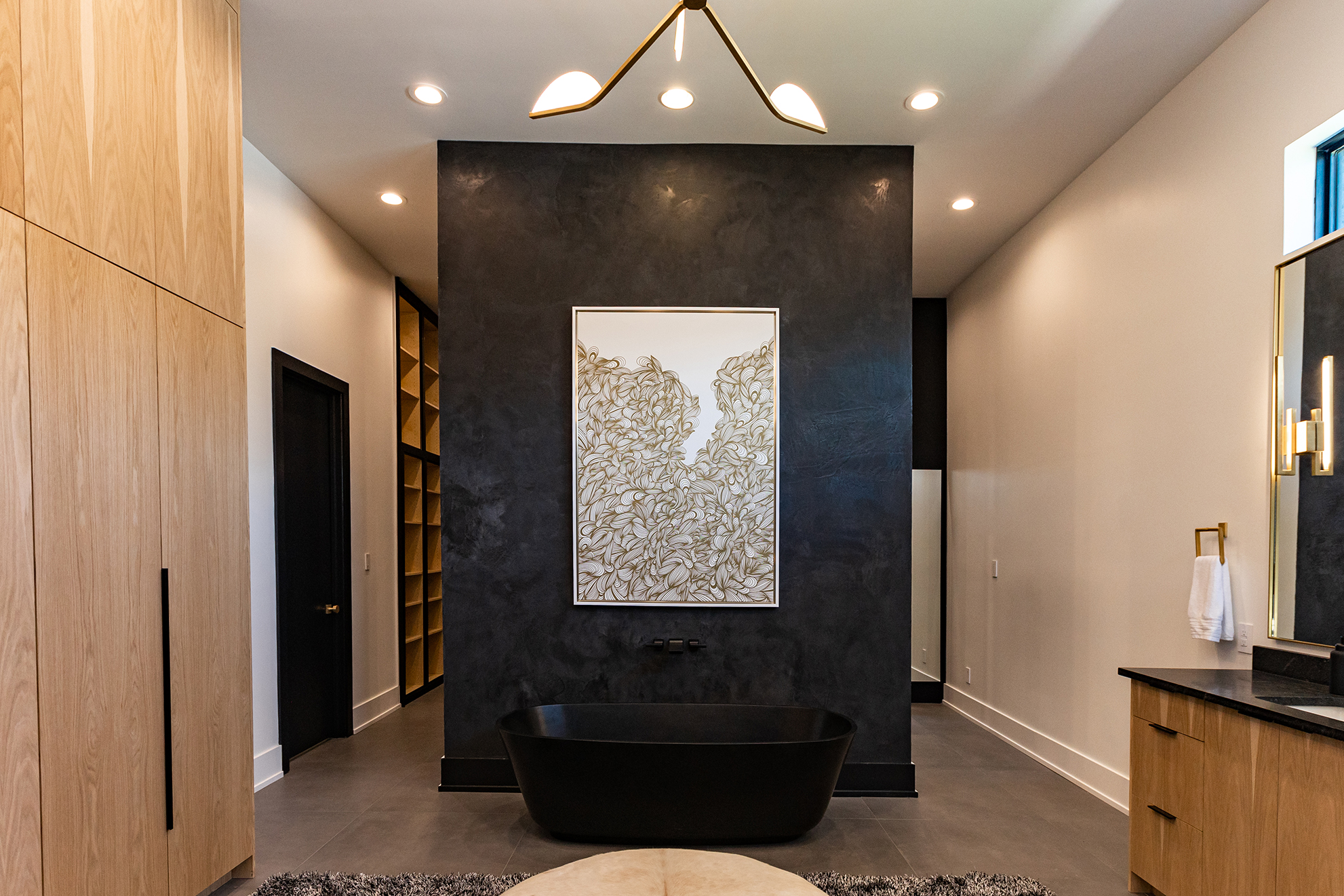 The finished home, which was completed just in time for the Parade of Homes in April, makes a statement before a visitor ever steps inside. It all starts with the color—or absence of color, if you will. “For Ellen, black was a big thing,” Shane says. “She didn’t want off-black or kind of black or anything like that. She was very adamant about it, even though everyone tried to suggest slightly lighter shades because they were afraid it would feel too dark.”
