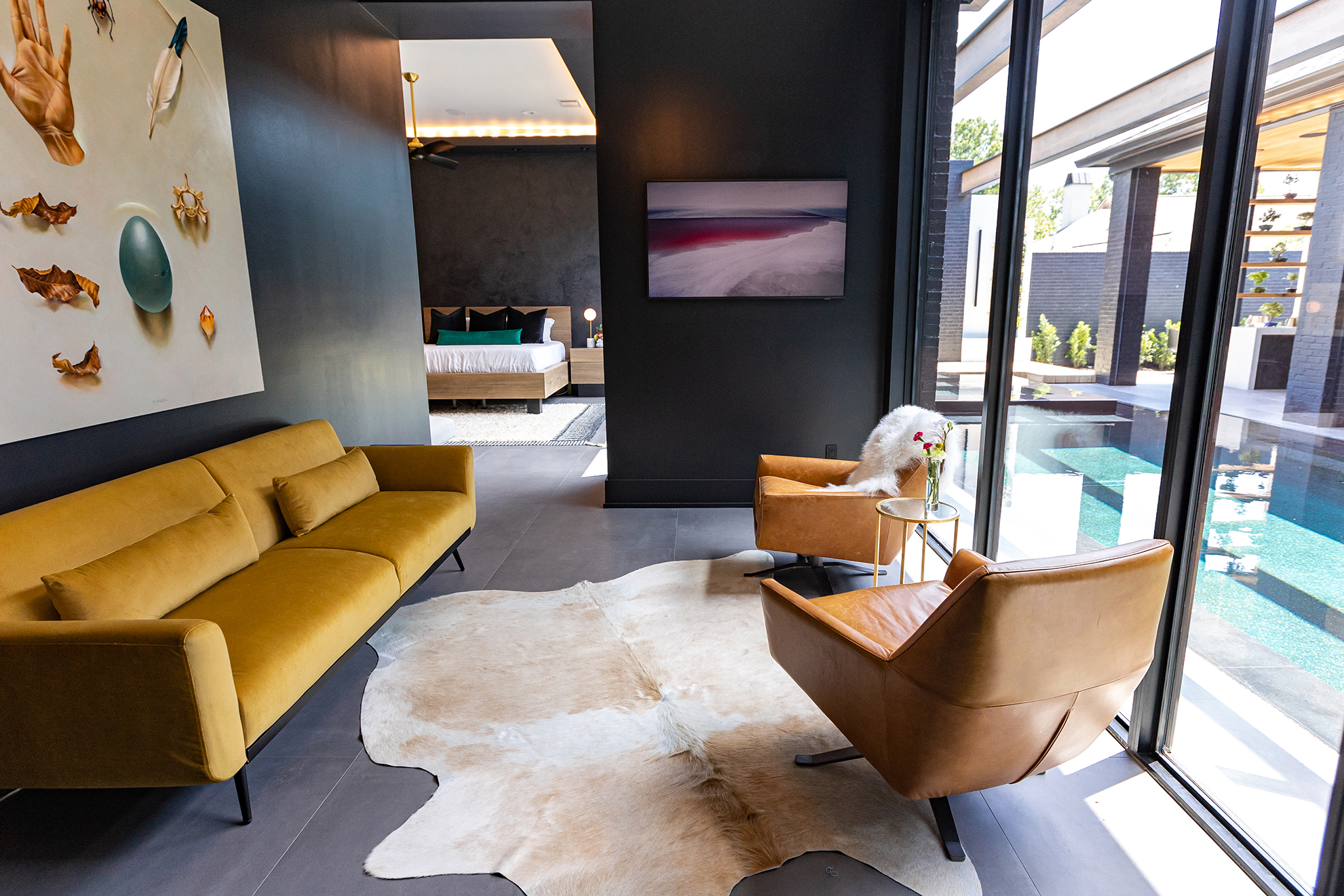 Once inside the front door, the drama steps up a notch further, thanks to a floating black brick wall conceptualized by Walker and two stag paintings by Demond Matsuo that give the first indication of the vital role art plays in this home. “It was really important to us to not just buy art to fill the house,” Ellen says. “We wanted to make sure that everything we got meant something to us and was something that we really loved.”