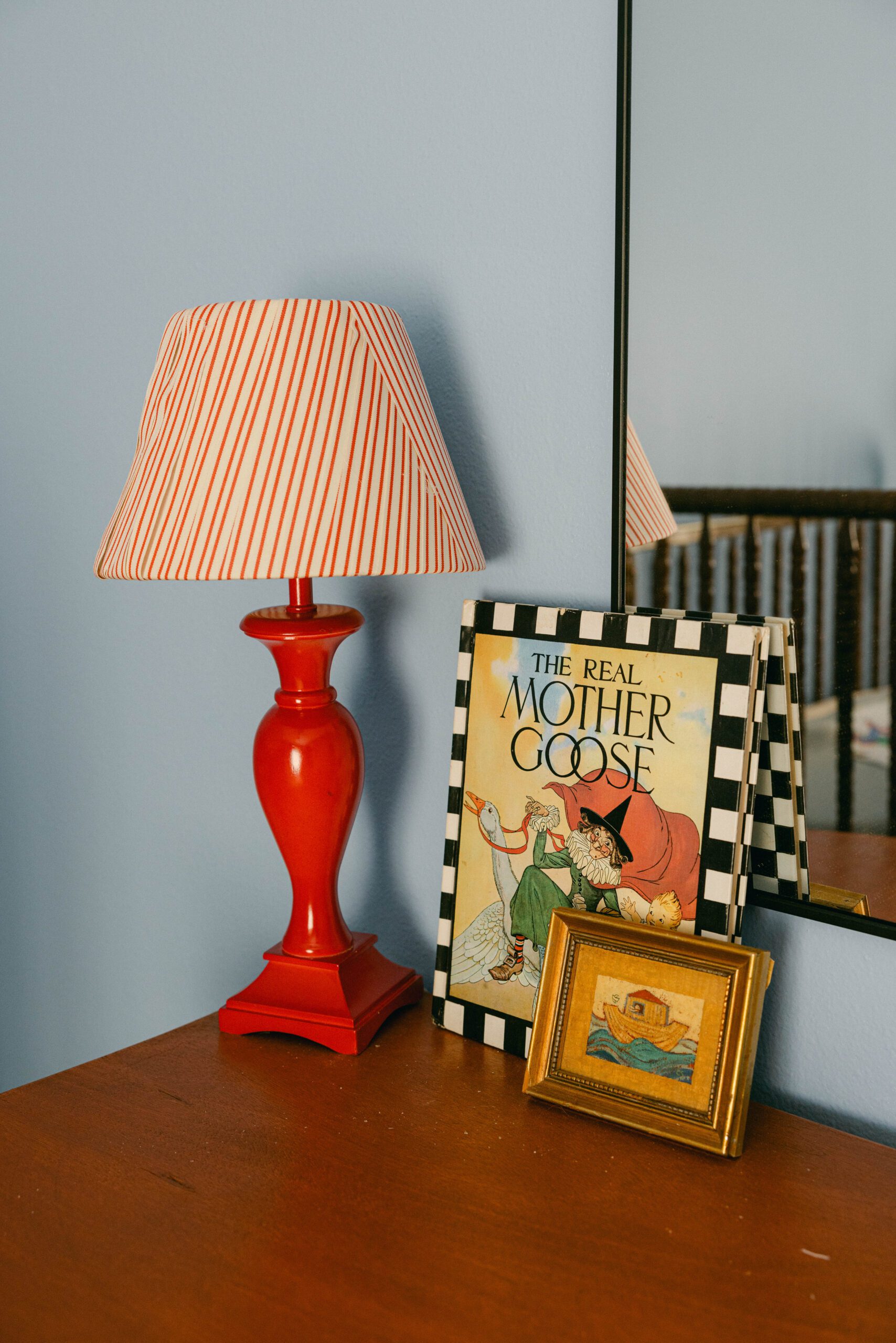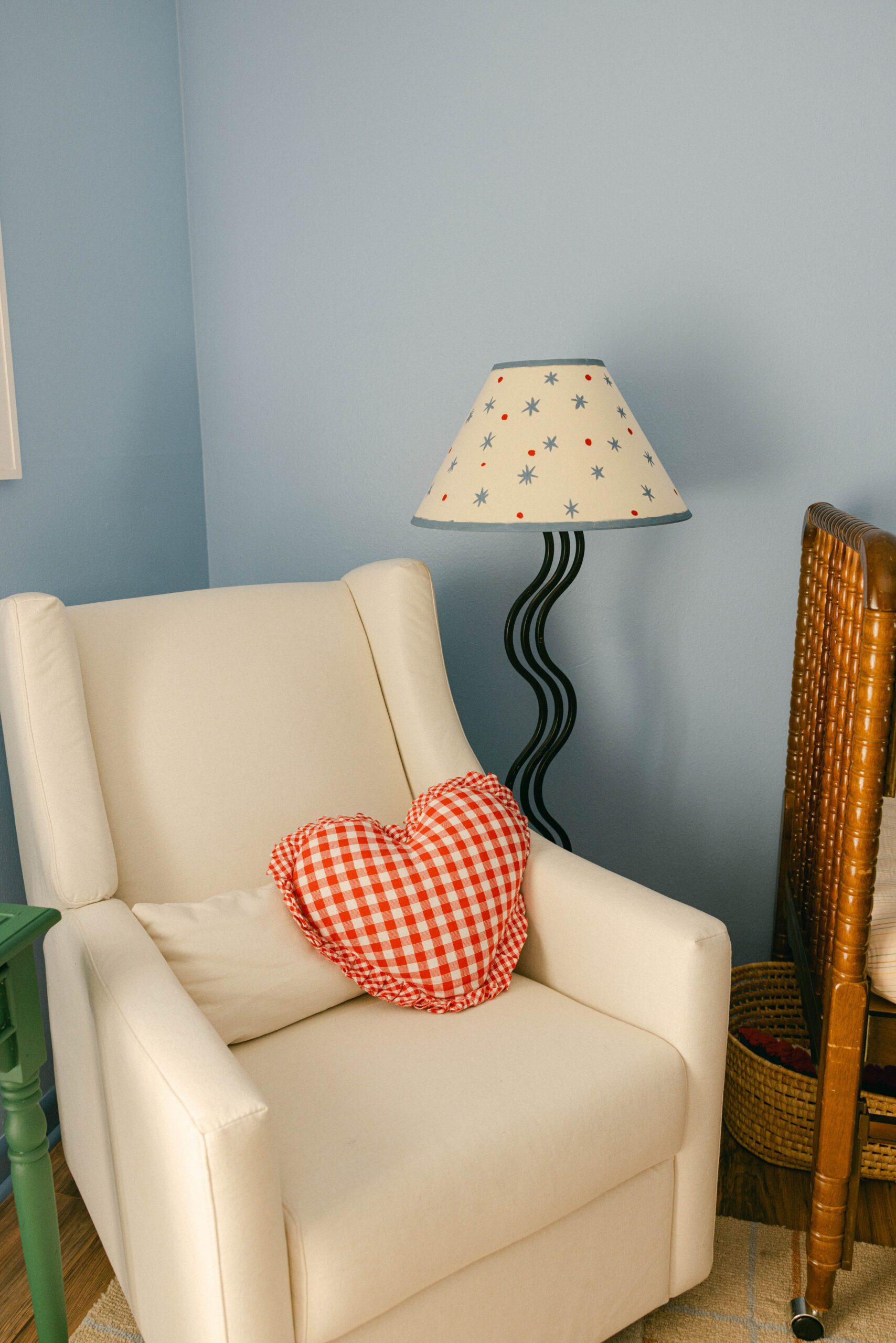 When it came to thrifting items for upcycling, Esser spent countless hours scouring the internet and local sources for pieces with potential. “I would have a vision of, let’s say, a green nightstand, so I searched thrift stores and Facebook Marketplace until I found a style I liked that I could just paint,” she explains. She repeated that same hunting and fixing process for both of the lamps, the dresser and more.