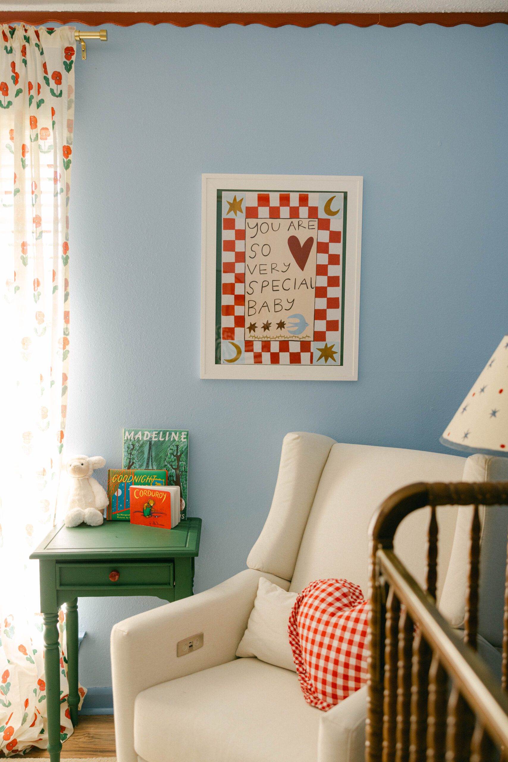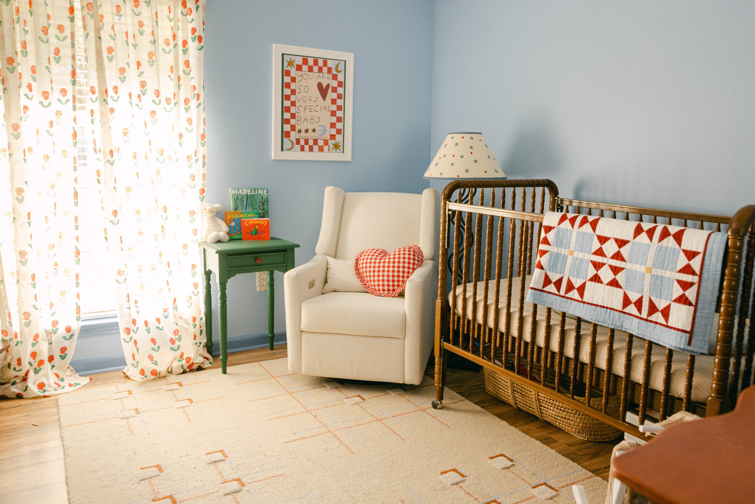 “I wanted it to feel a bit vintage and nostalgic, with pops of color,” Esser explains, noting that the colors within the room were inspired by children’s books like Madeline and Corduroy. “I couldn’t picture a standard, girly room for Isla. I was just drawn to more primary colors as a base and then adding a few feminine touches like the flower curtains.”