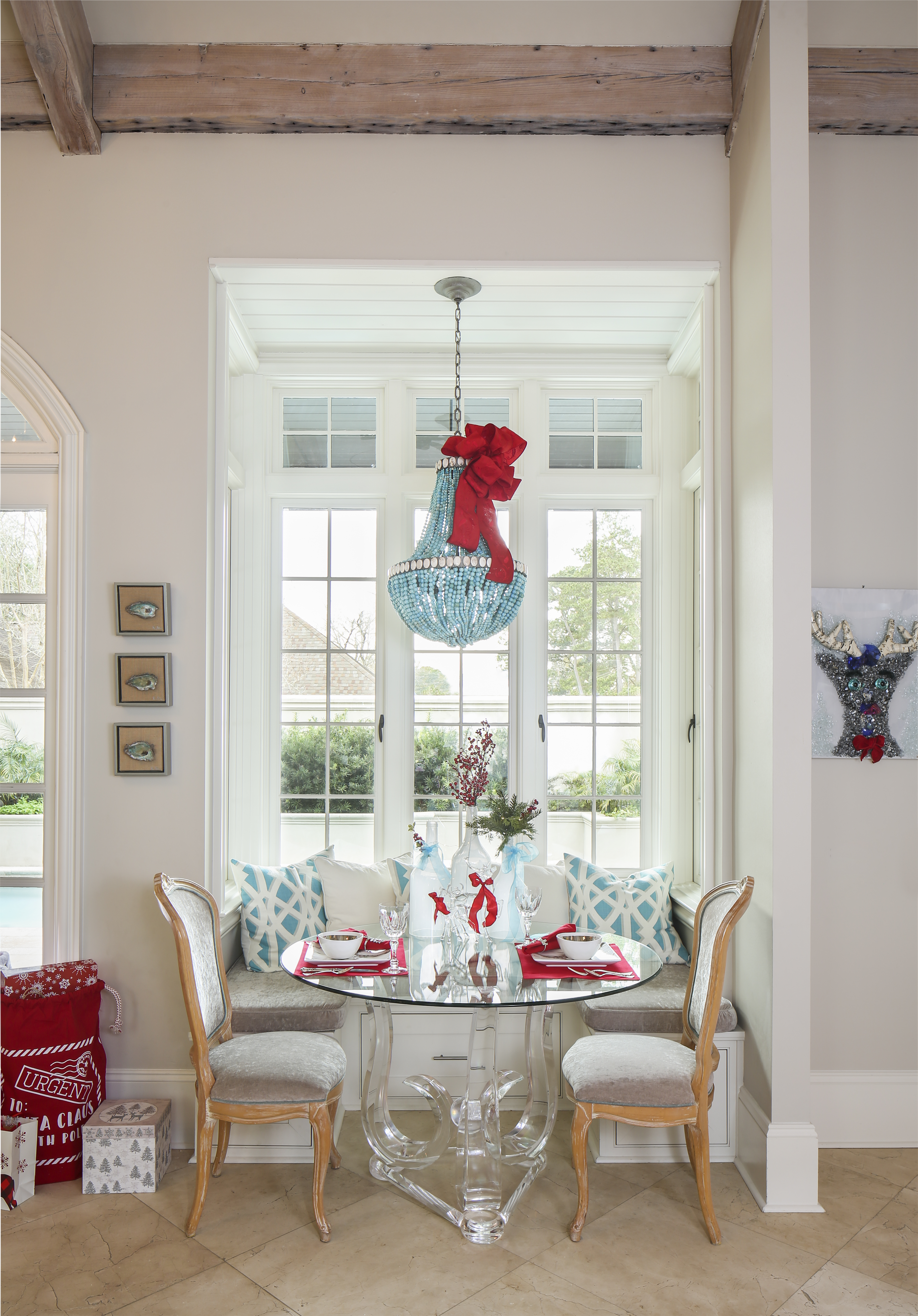 “One year, I decorated everything in silver and turquoise,” says Cleme. “But one of my grandsons said that I needed to use red because it was Christmas, so now I incorporate red and turquoise all season long. It’s unexpected.”