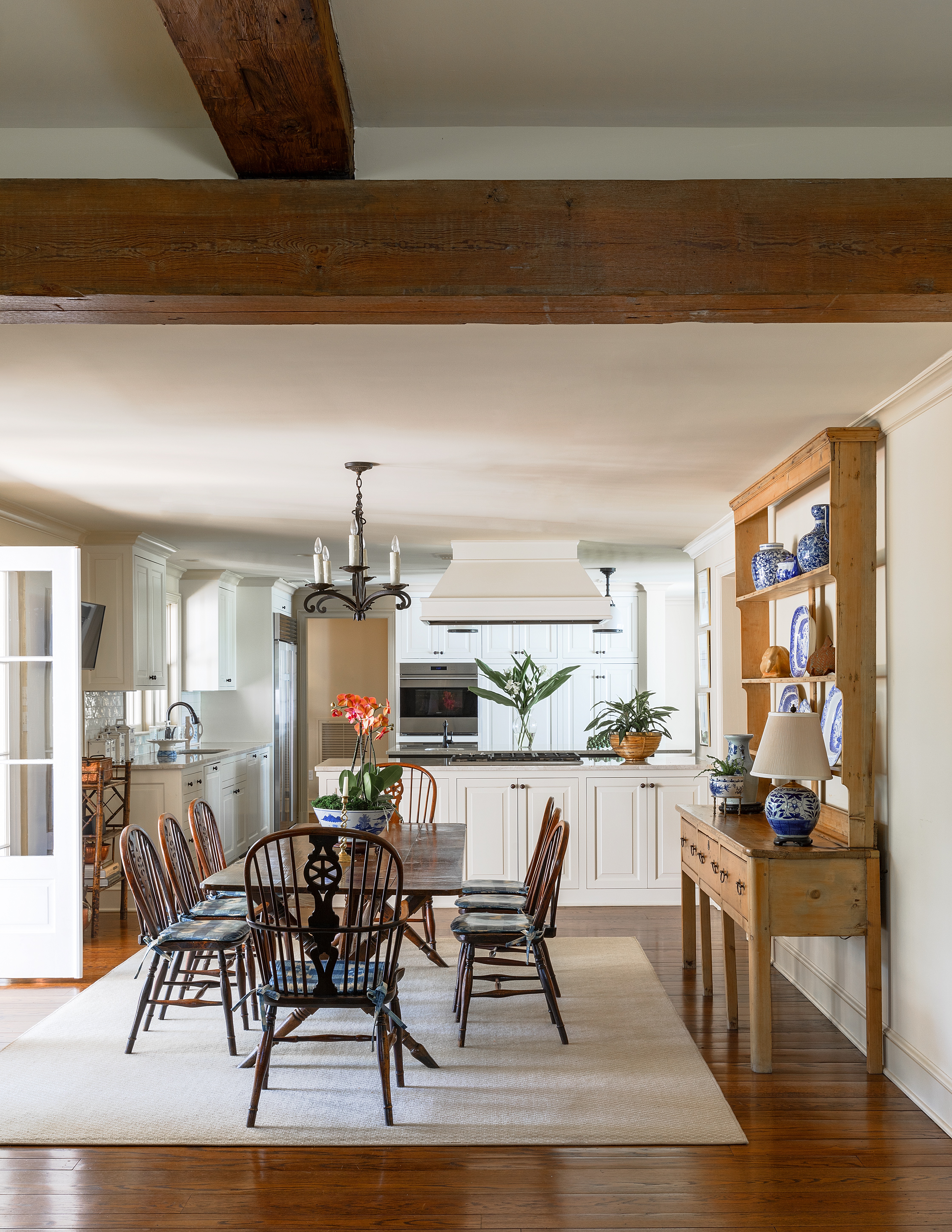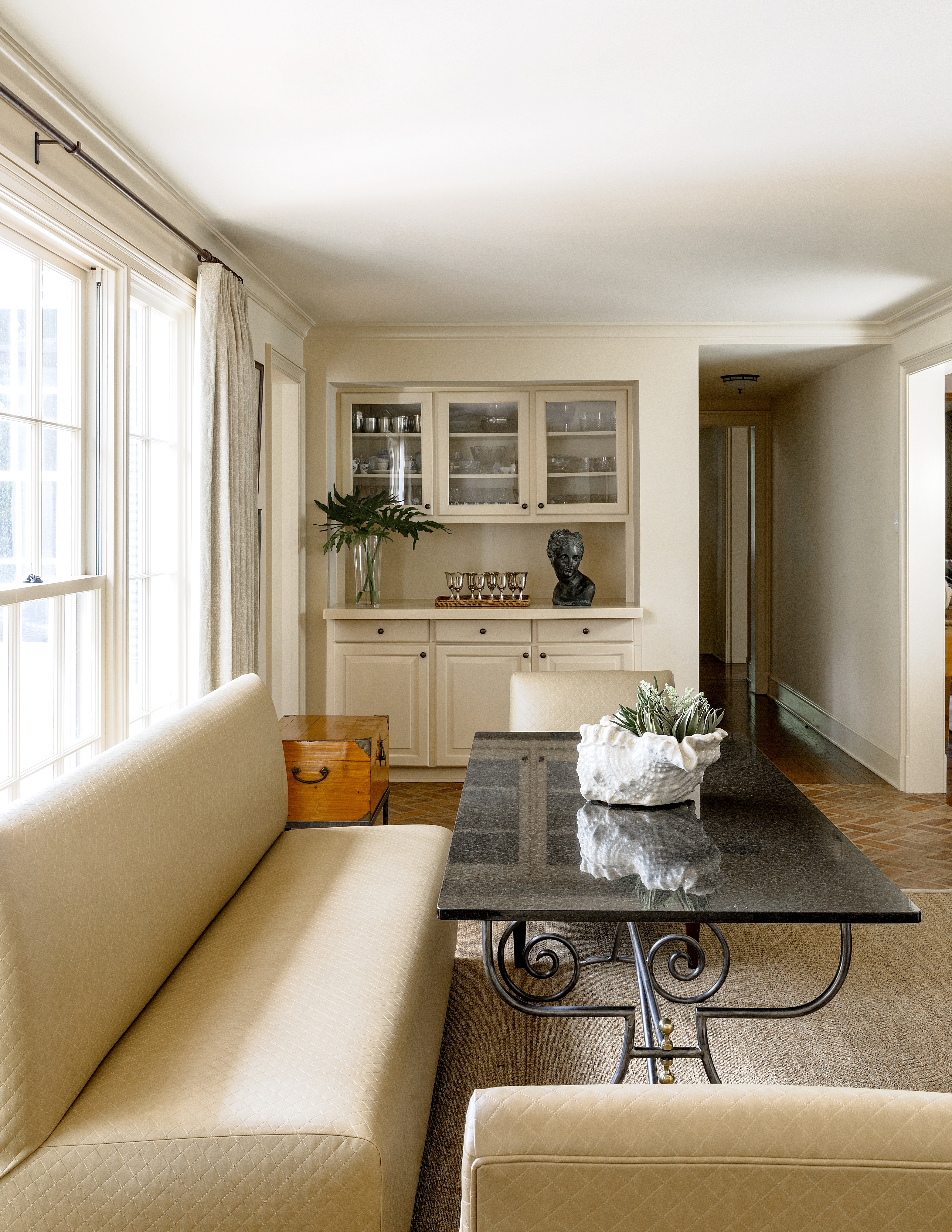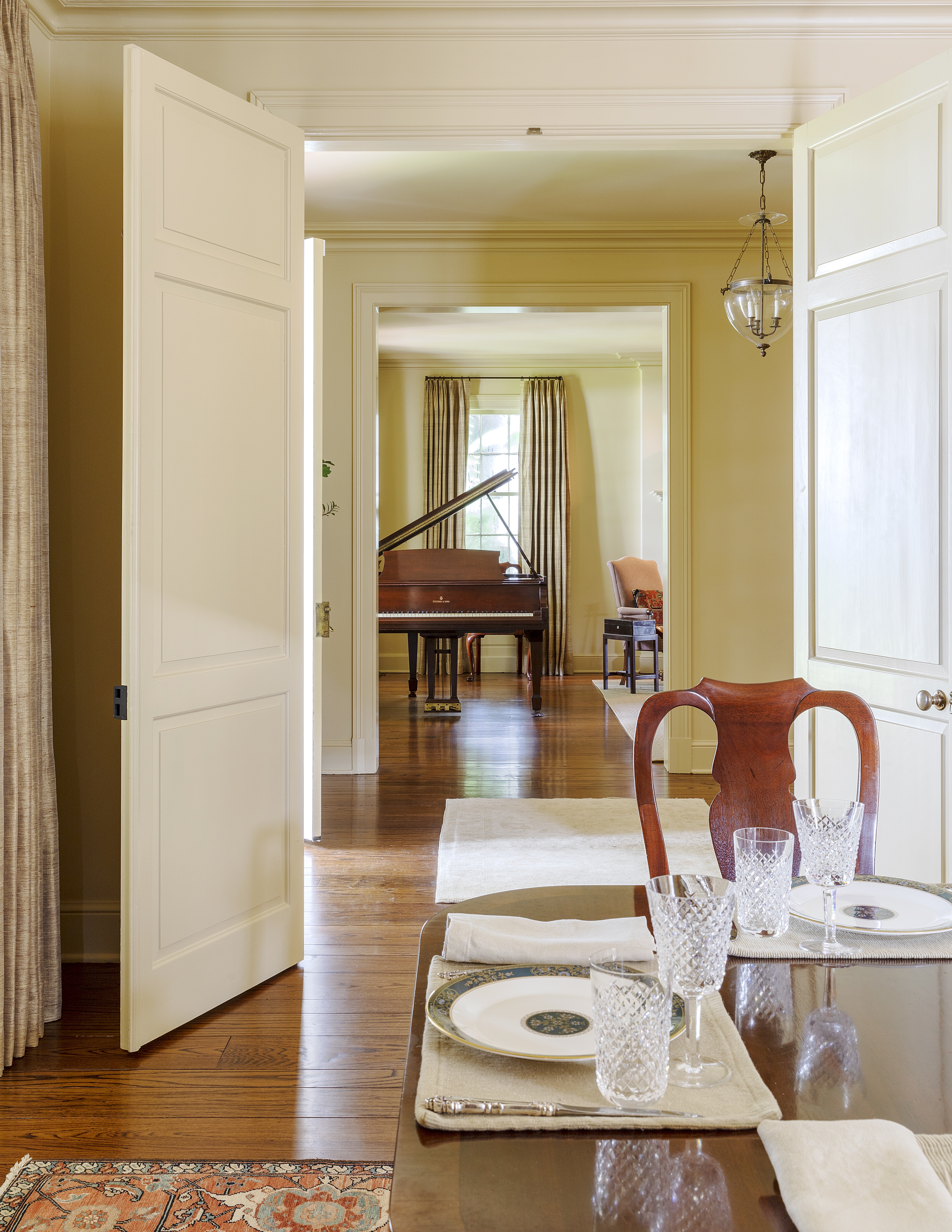 Happy memories made the decision to purchase this home an easy one for Kris and Jane, who moved into the house in November 2015. In collaborating with architect Russell Washer and contractor Gary Spurlock on a renovation that would create a better flow among the interior spaces—“it was a traditional, kind of chopped-up layout,” Kris explains—they made sure to retain as many of Town’s classical details as possible.