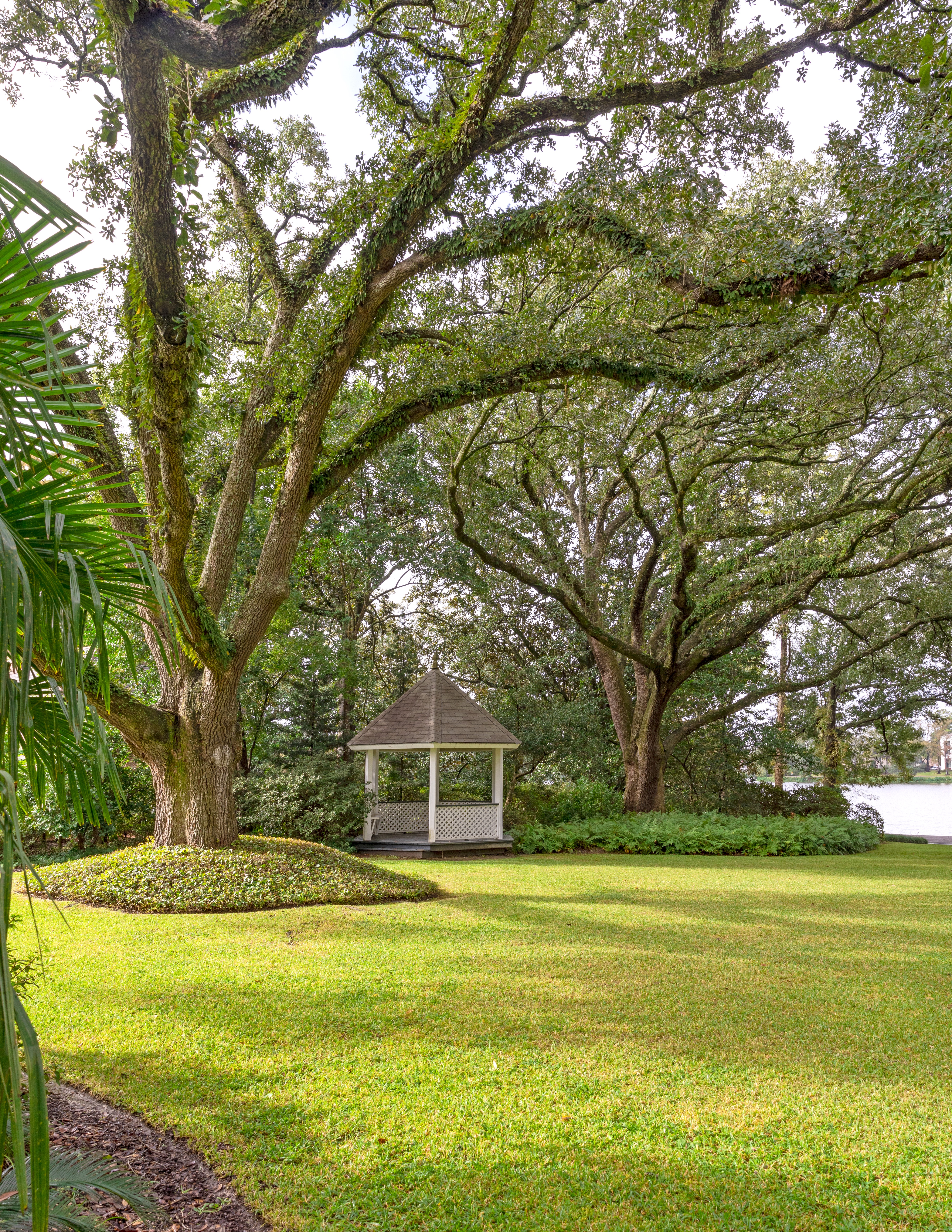 Outdoors, the Kirkpatricks turned to landscape architect Wanda Huh to refresh the yard in a way that would complement the four old oak trees in the front and an even larger one in the rear. The design also honors the placement of a gazebo that Claude and Edith constructed in the front yard in the 1980s to resemble a gazebo on Edith’s family’s ancestral home in Claiborne Parish. “Wanda designed curved beds like Steele Burden would have done,” Jane says. “We also had an arborist in to cut the trees in such a way that it opened up the view of the house from the road and opened up the lake views for us.”