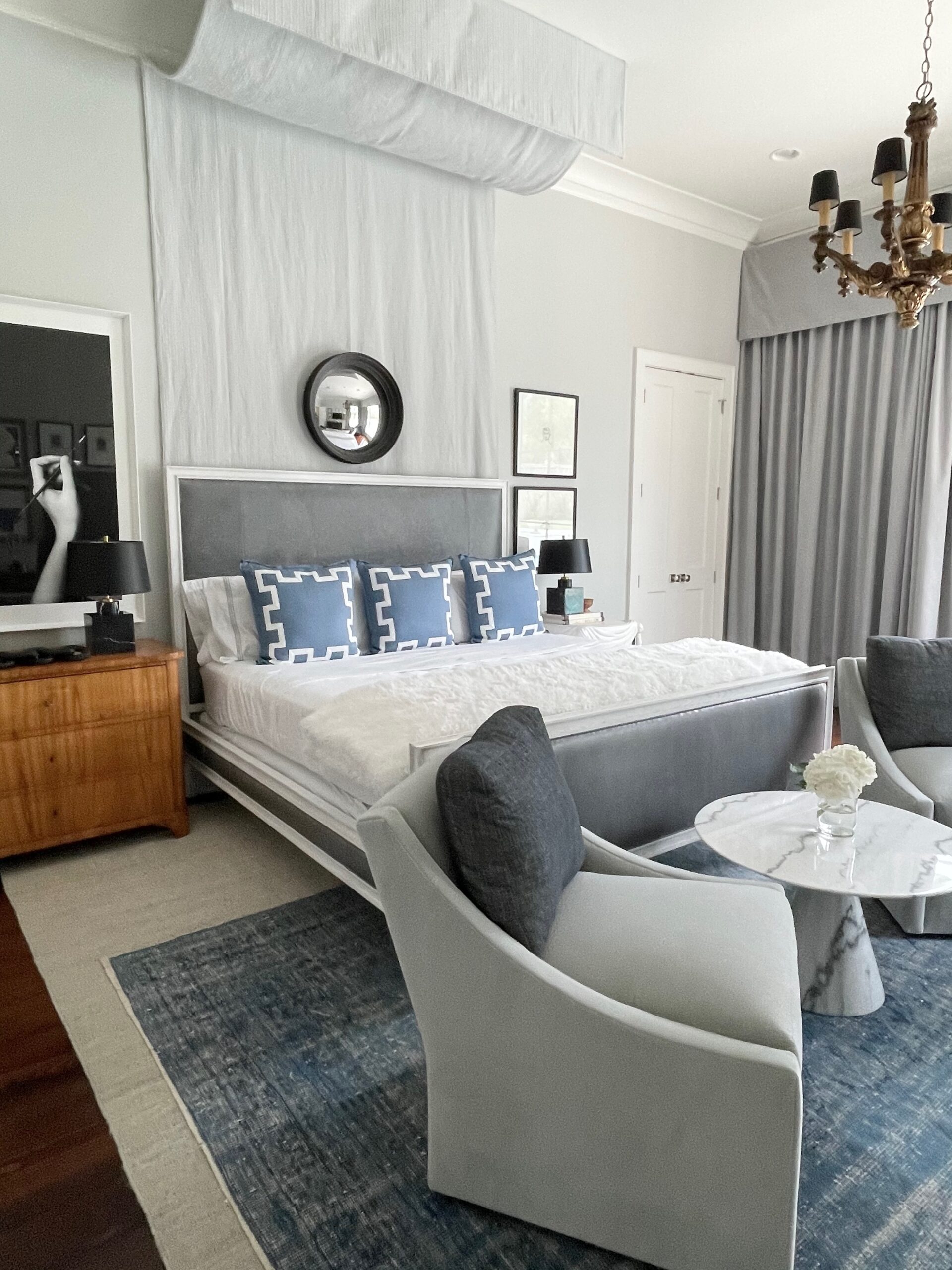 What this also does is create dimension and break up the space a bit more, so that it’s not so overwhelming to the viewer. “Since hand-knotted rugs are typically priced based on the square footage of the rug,” he says, “smaller versions allow them to be acquired far less expensively while still adding a dose of quality and interest to a space.”