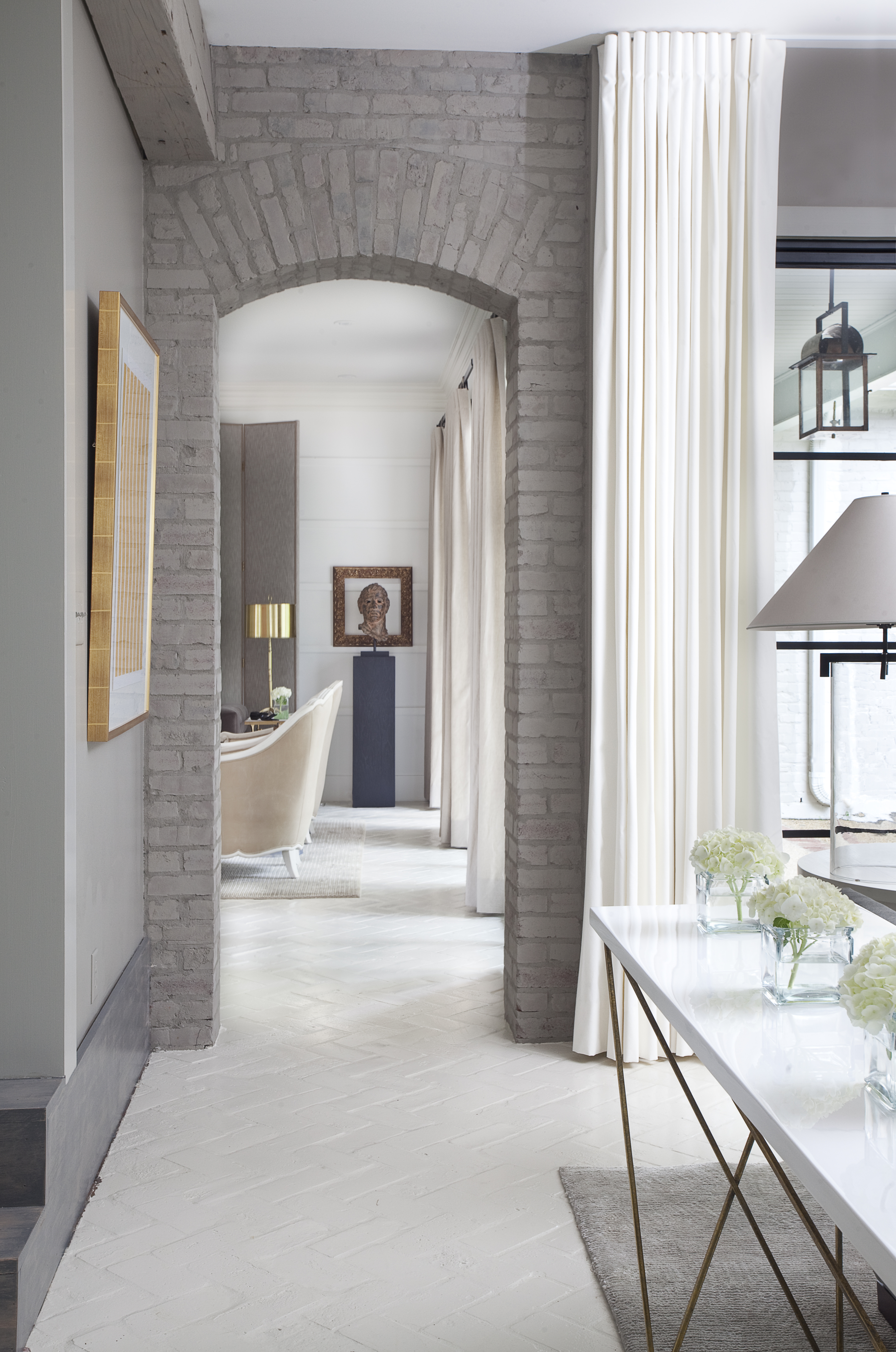 “This space we designed [below] —which was previously dark and rustic—employs this design tool to its maximum effect,” says Larkins. “Repainting the walls, ceilings and even the brick floors served to lighten and modernize the space without actually changing any of these surfaces.”