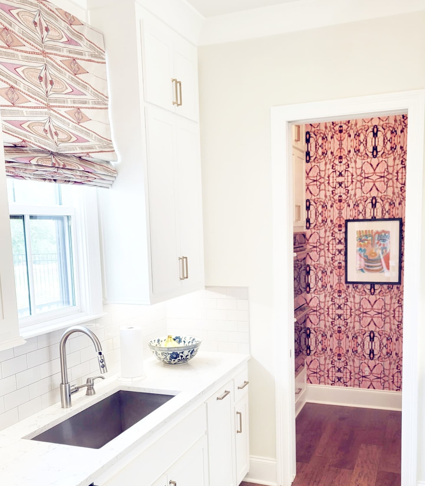 Pairing the Amanda Talley wallpaper with a complementary Roman shade above the sink in Griffin’s project was crucial for tying the kitchen together. “We worked off that wallpaper, then selected the fabric I thought would pull in some of those color pops throughout the house without being too obnoxious,” he says.