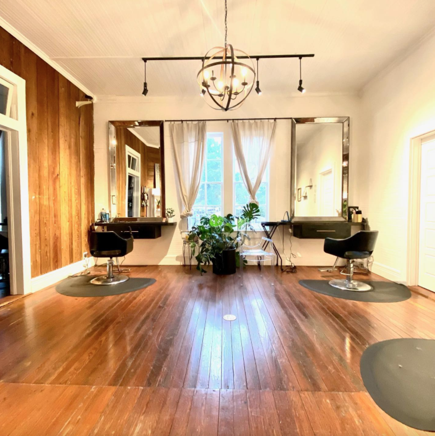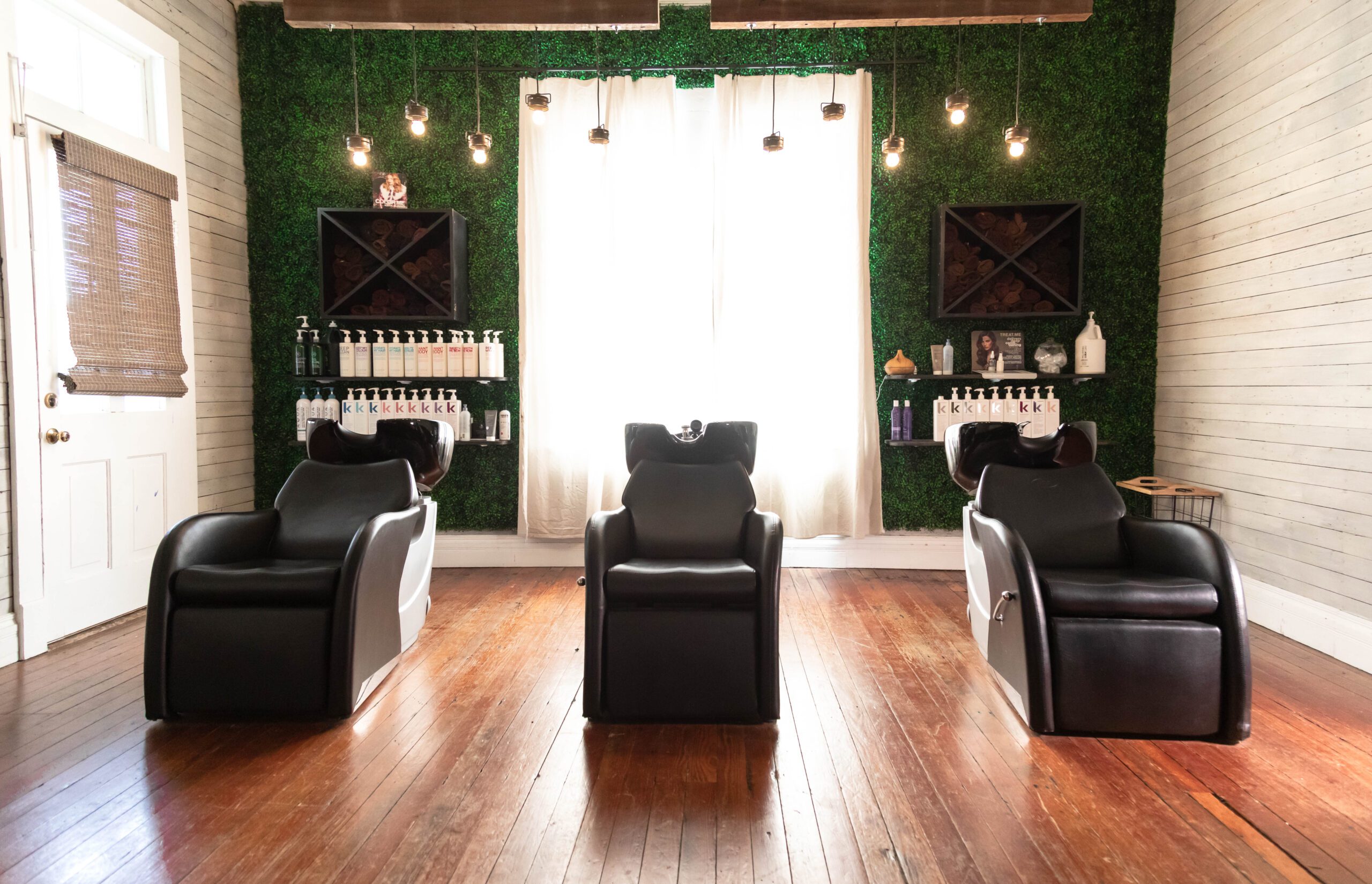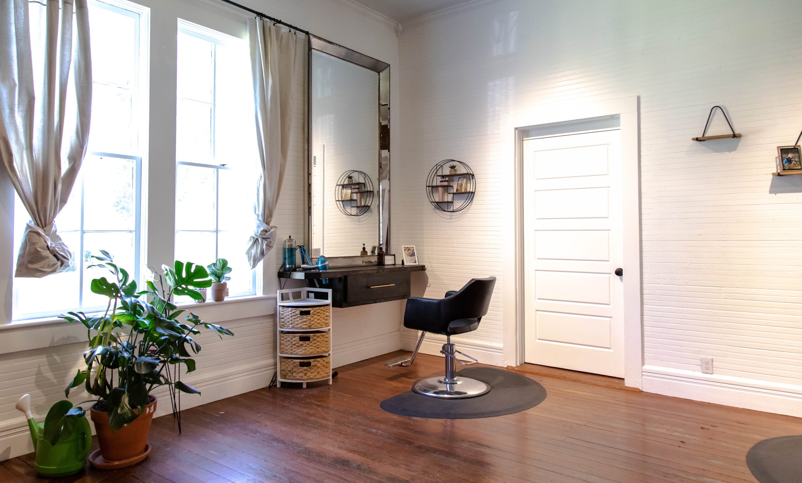 One of the first things you notice when you’re facing the salon is the light blue porch. Thrower wanted to keep the original plantation style alive. “Back in the day, they would color the porch light blue to cool it down from the heat; I didn’t want to take the history away from the home,” she says. It’s also a great way to add a fun pop of color in a place you least expect. A dark green encircles the front door and window frames, for example. The darker color contrasts with the porch and creates dimension and depth while keeping it from looking too flat.