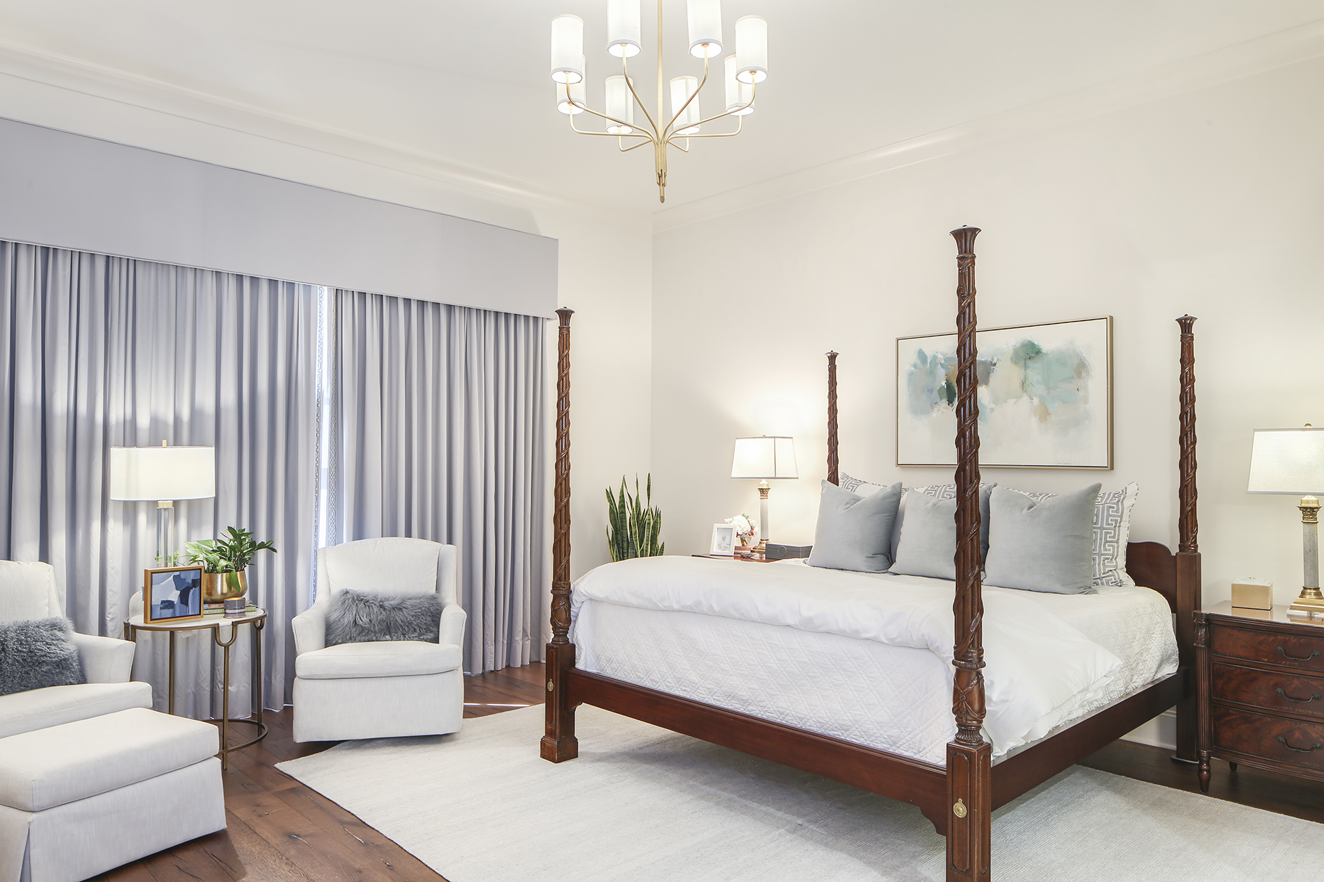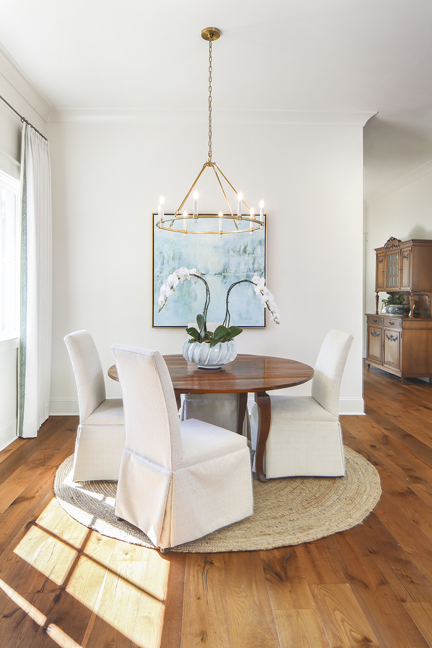 The curtains’ color palette is carried throughout the home not only through other textiles like throw pillows but also through art. An abstract work by Brooke Hoogendoorn hangs in the living room. A moody landscape by local artist Mike Klung is the foyer’s statement piece. And in the breakfast room off the kitchen, a custom piece by Johnson herself completes the space. “The art was the one thing that my husband wanted to be a part of,” says Sheila.