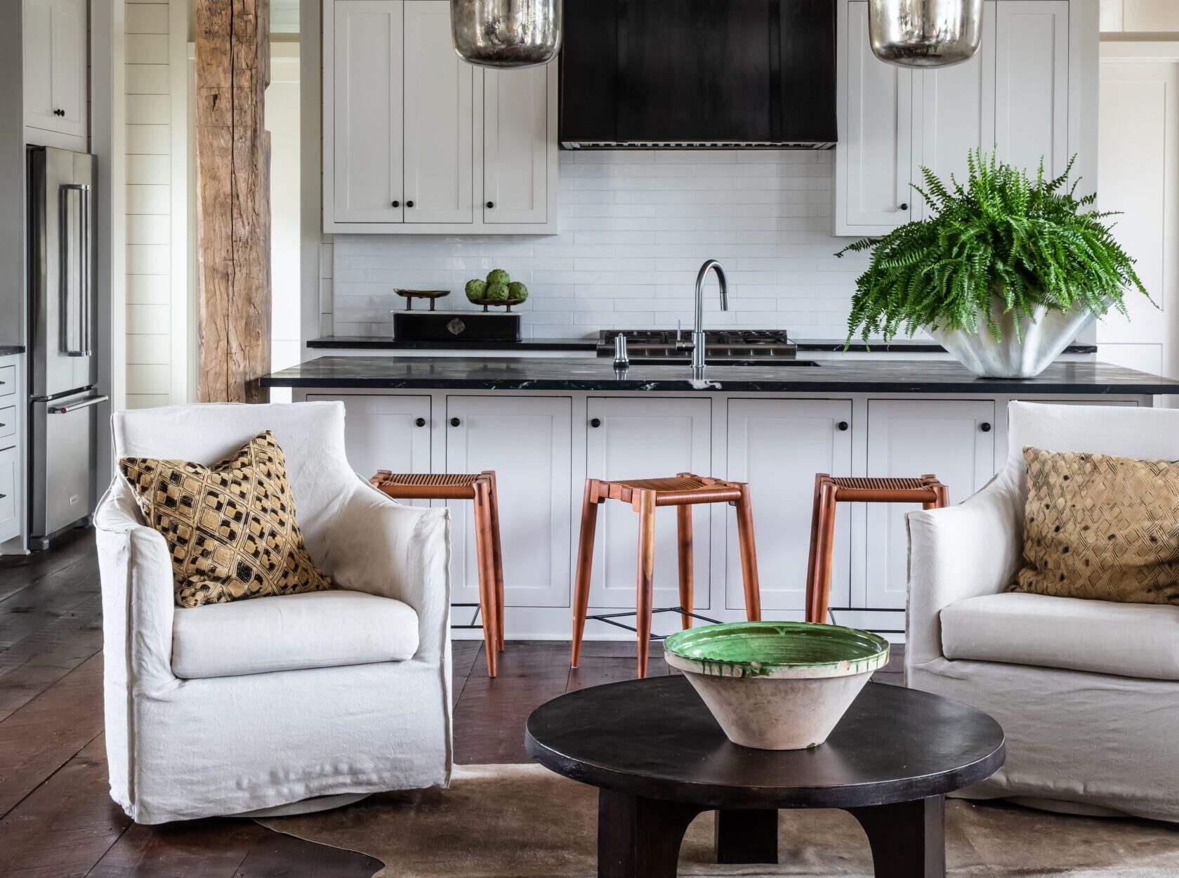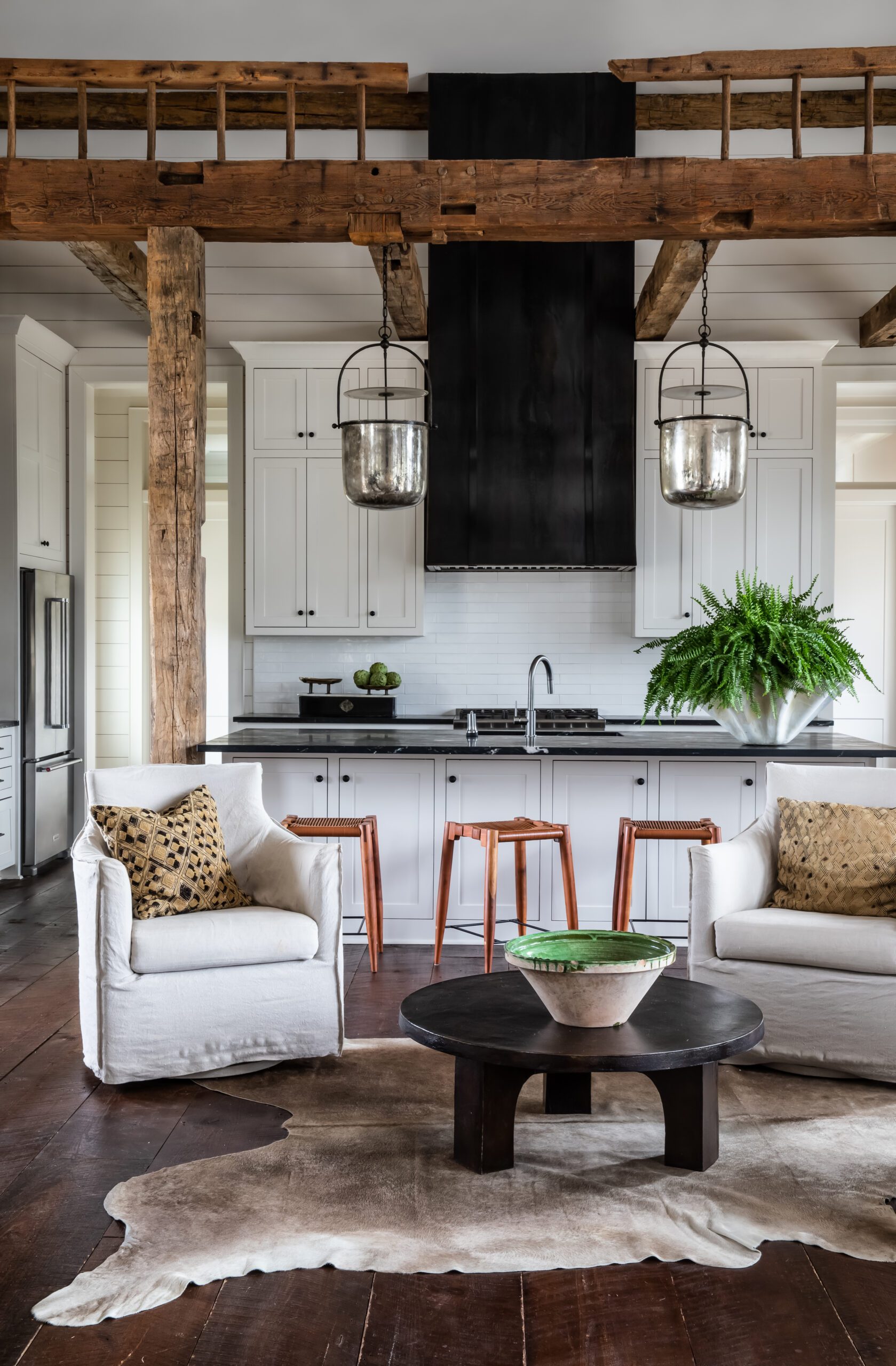 Hance Day Hughes, principal architect at TIEK BYDAY, designed this St. Francisville retreat for his parents, Lynette and Brett Hughes. Contrast takes center stage through a combination of rustic and modern elements, like the hand-hewn beams and 600-pound steel range hood. Read more about how Hance embraced metals and a taxidermy collection for this close-to-home project here.
