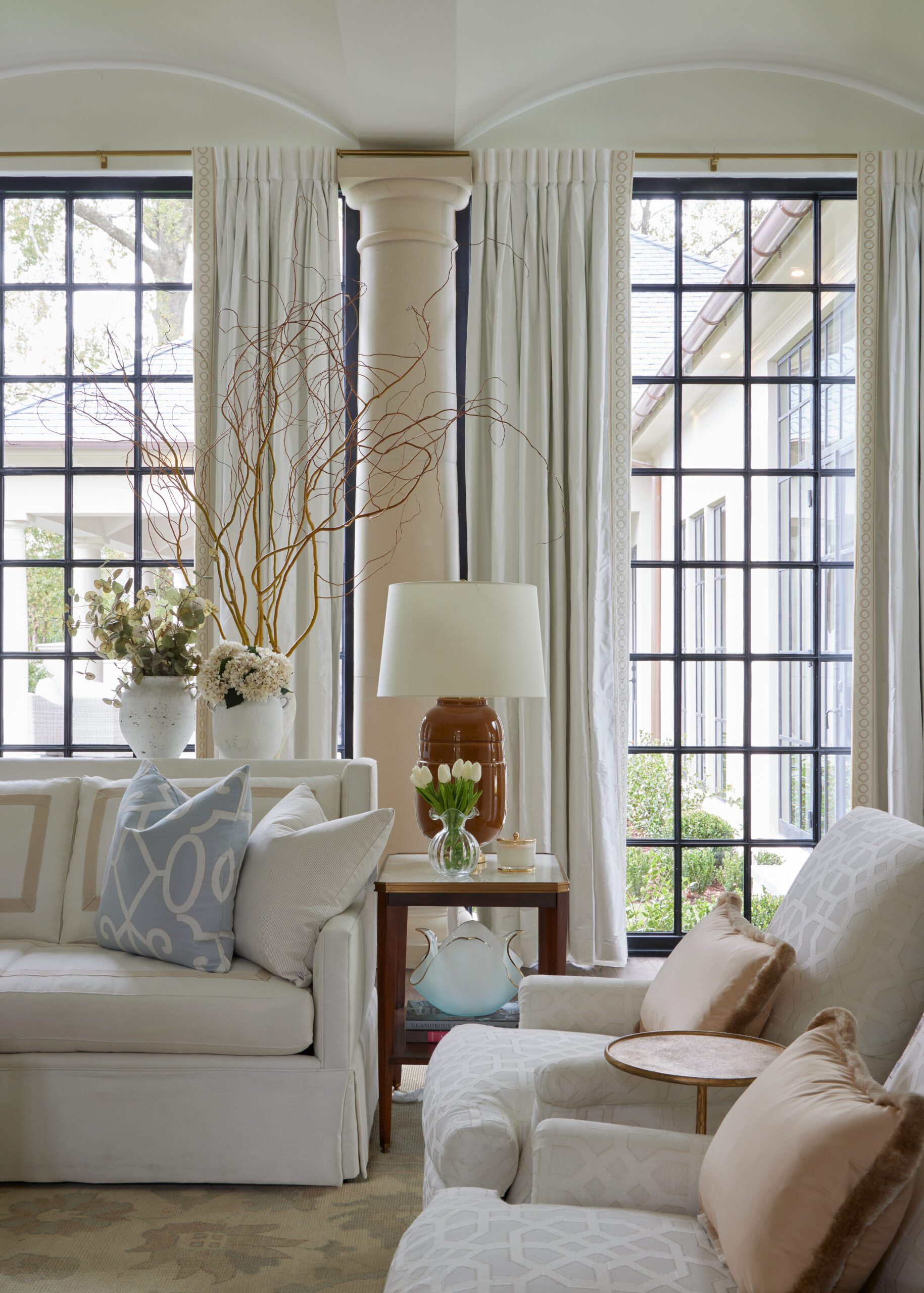 A barrel ceiling and a clear line of sight from the front door through steel windows overlooking the backyard make the formal living room of the 2021 Ivy House Designer Showhome a unique canvas for furnishings by New Orleans designer Rivers Spencer. Her soft color palette of white and blue with touches of ginger give the space an ethereal glow, drawing the eye upward as natural light fills the space.